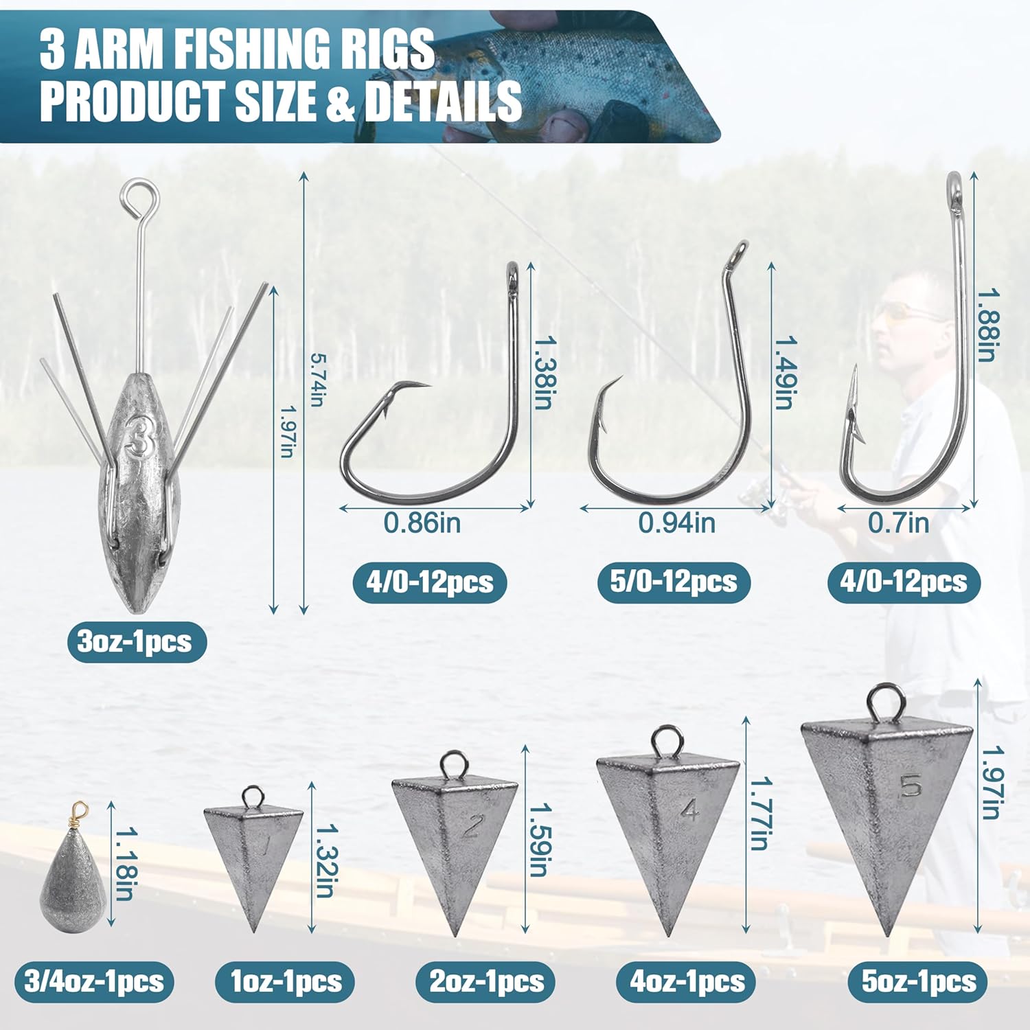 Surf Fishing Tackle: The surf fishing rig kit includes 12pcs 2 arms stainless steel fishing wire leader rigs, 12pcs 4/0 octopus straight eye offset circle hooks, 12pcs 4/0 J hooks, 12pcs 5/0 angled back eye offset circle hooks, 4pcs pyramid sinkers weights (weighing 1oz 2oz 4oz 5oz respectively), 1pcs 3oz sputnik sinker weight, 1pcs 3/4oz bass casting sinker weight.