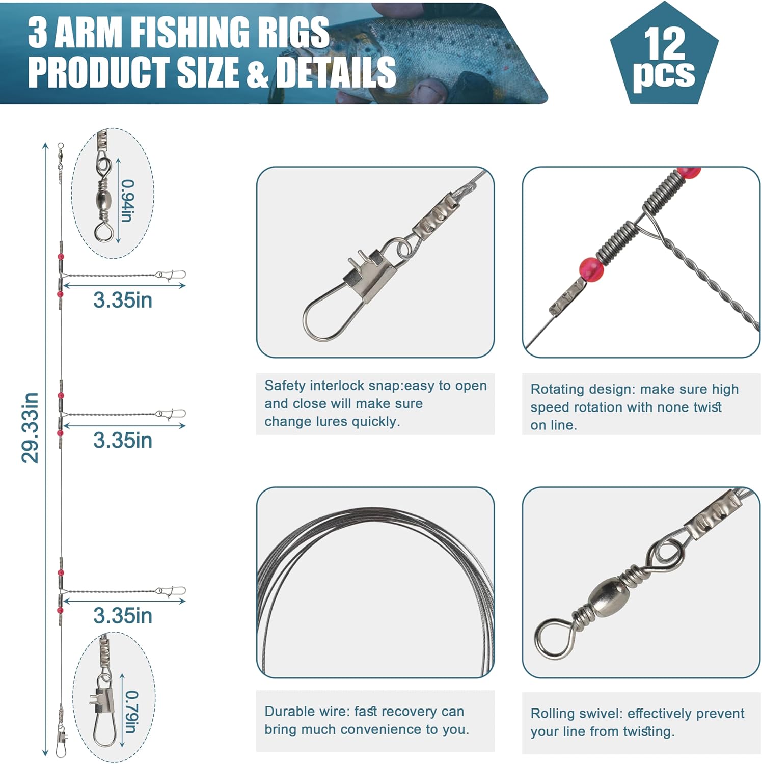 High Strength Wire Leader Rigs: The wire leader is made of high-quality stainless steel material, which is sturdy, durable, corrosion-resistant, and not easy to rust. The fishing wire leader rig consists of fishing wire leader and 2 arms, equipped with snaps, swivels and red beads. Length 24.8 inches, test weight 90 pounds. Arm: 5.51 inches, 70lbs test weight.
