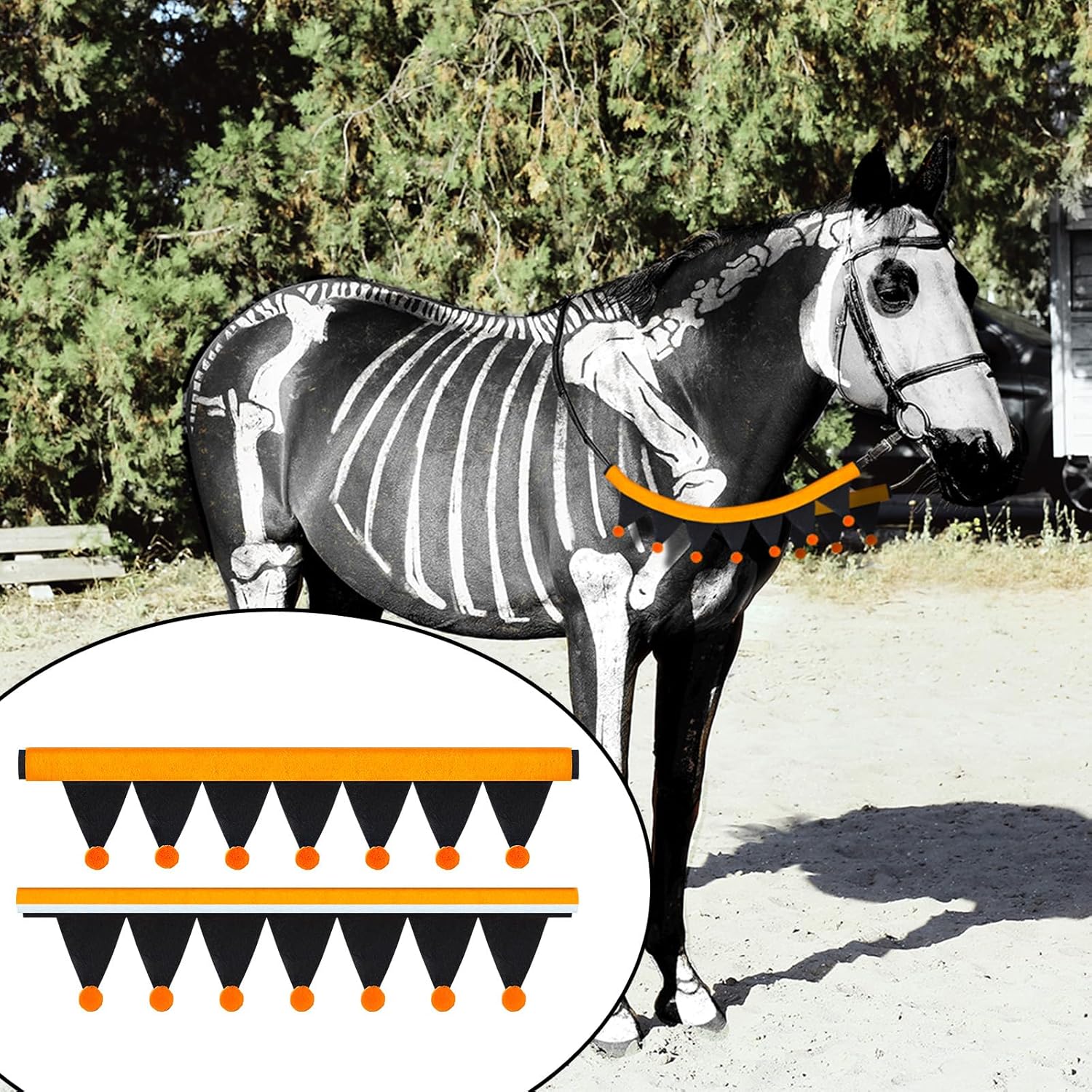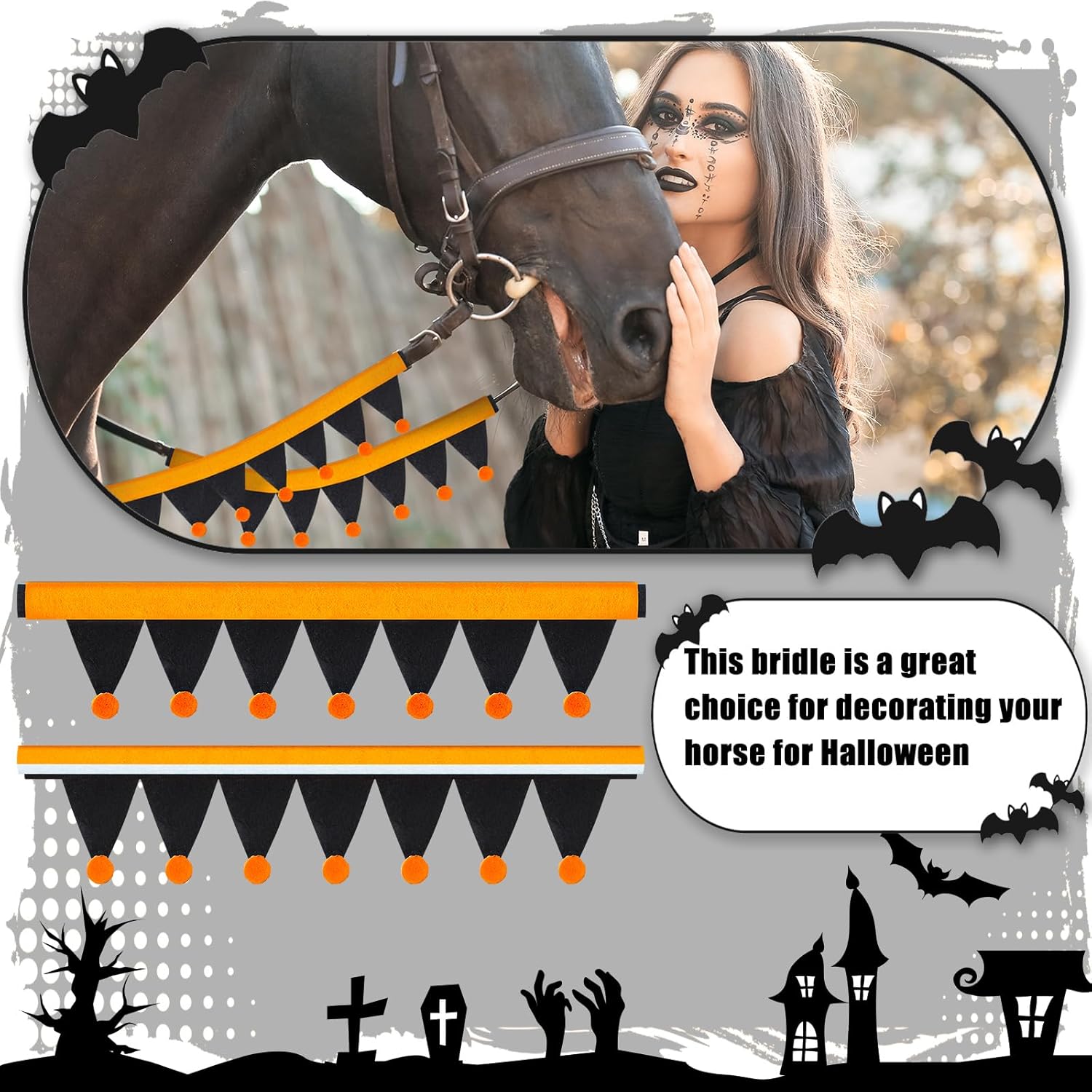 Elevate Halloween Atmosphere: the Halloween rein cover set well blends vibrant colors with intricate design, embodying the Halloween spirit. It’s the ideal choice to enhance the festive mood for your horse’s set up, truly highlighting the holiday theme. The Halloween costumes for horses transform your horse into a stunning centerpiece of any celebration