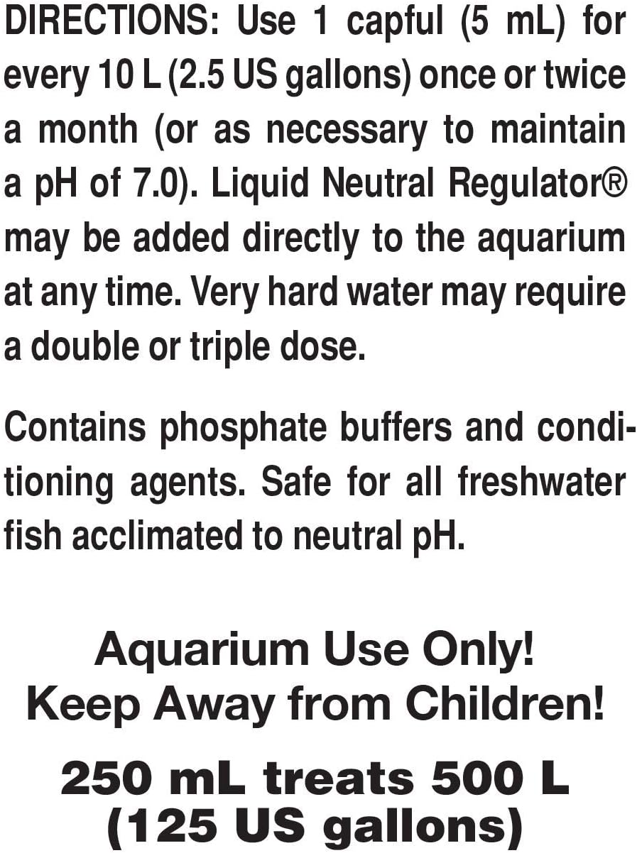 TANK USE: Use 5 g (1 level teaspoon) for every 40–80 L (10–20 US gallons) once or twice a month (or as necessary to maintain a pH of 7.0.) Neutral Regulator may be initially used daily in cases of high alkalinity until 7.0 is established