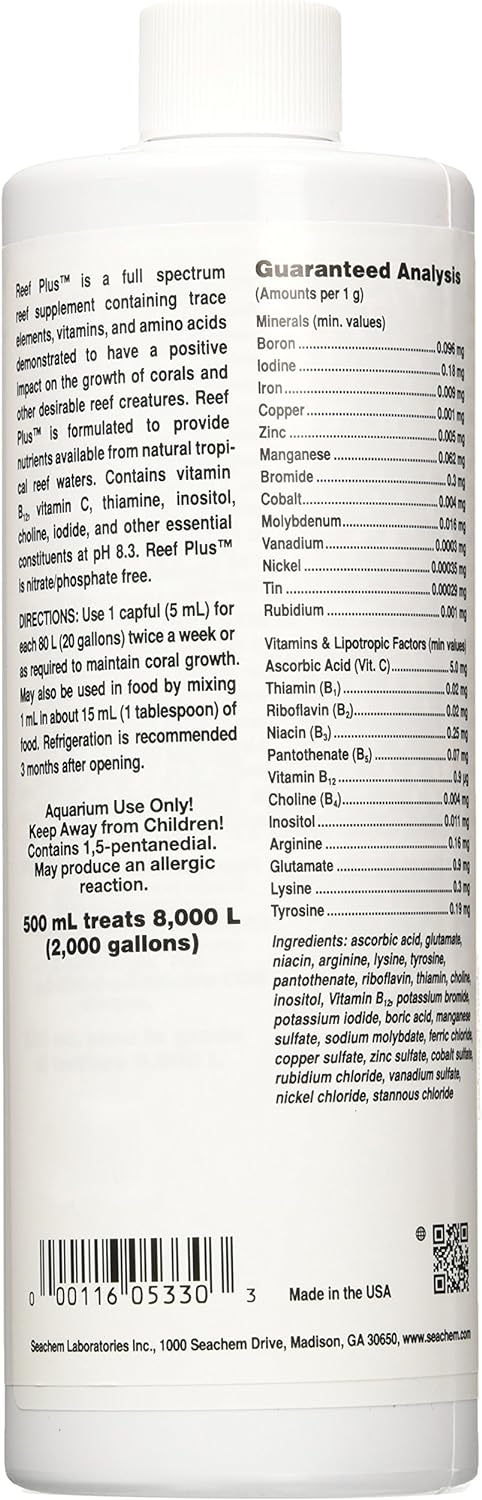 Sachem reef plus is a full spectrum reef supplement Containing trace elements, vitamins, and amino acids demonstrated to have a positive impact on the growth of corals and other desirable reef creatures. Sachem reef plus is formulated to provide nutrients available from natural tropical reef waters. Contains vitamin B12, vitamin C, THIAMINE, inositol, CHOLINE, IODIDE, and other essential constituents at pH 8.3. Reef plus is nitrate/phosphate free.