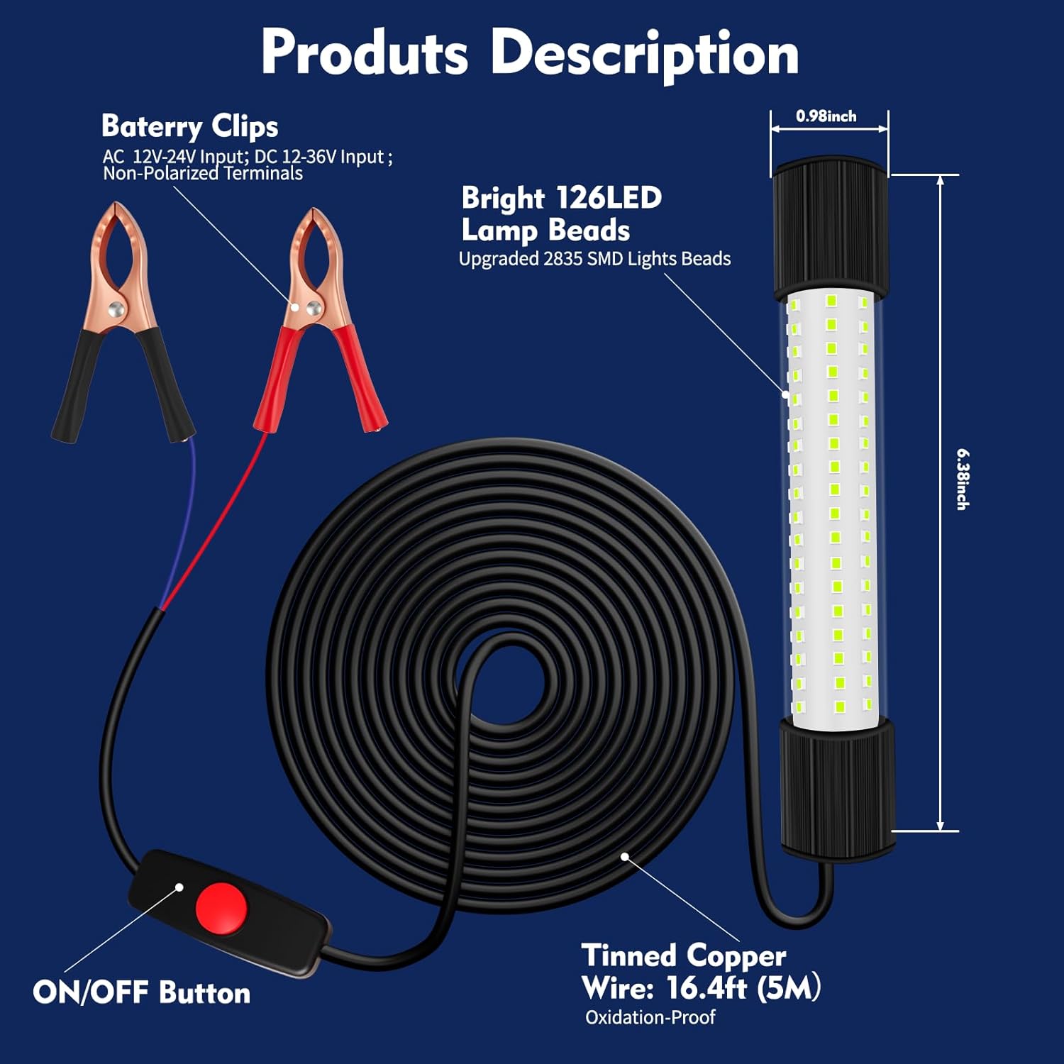 【1300 Lumen Fishing Light】 The powerful green fishing light features 126 upgraded 2835 LEDs for complete 360° fish attraction. The 13W fish light is compatible with DC 12-24V and AC 12-36V inputs. With its space-saving 6.38 x 0.98 inch design, this fishing light delivers powerful 1300-lumen brightness while maintaining excellent heat dissipation for extended lifespan