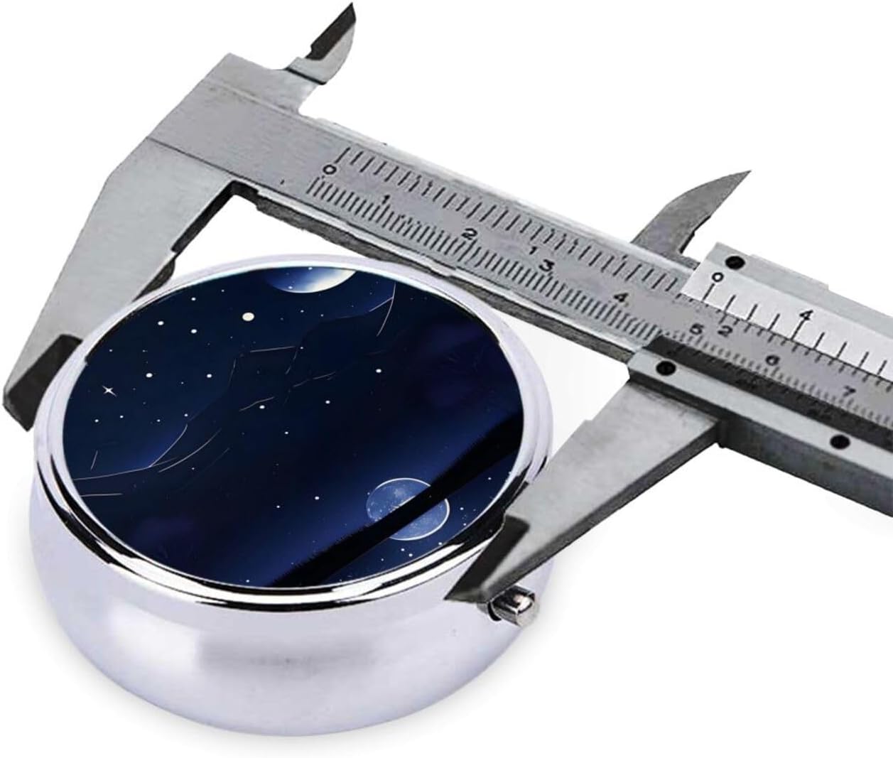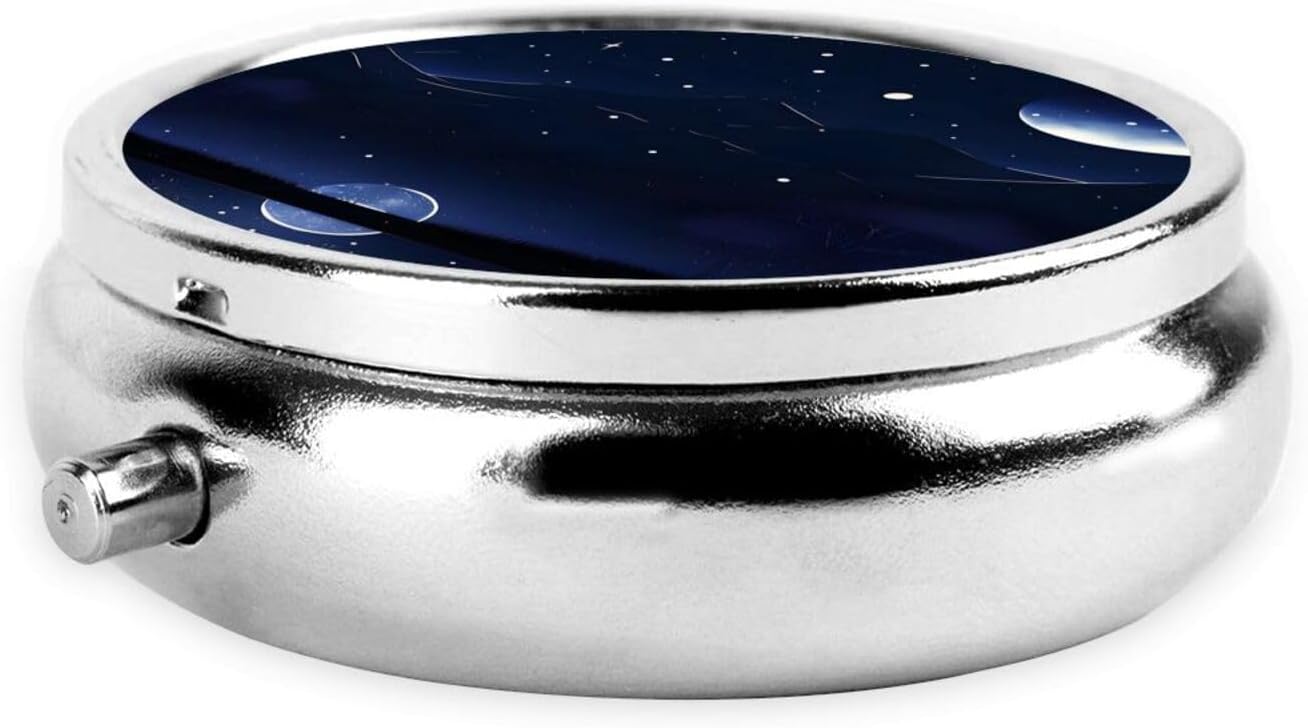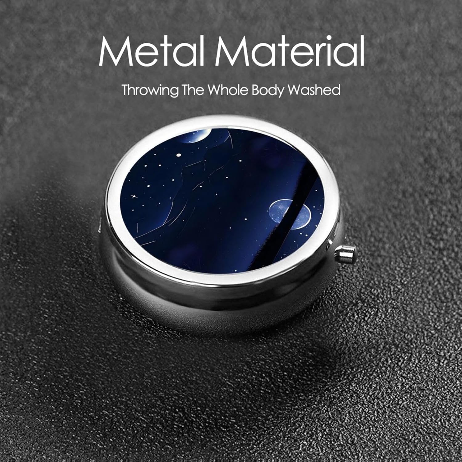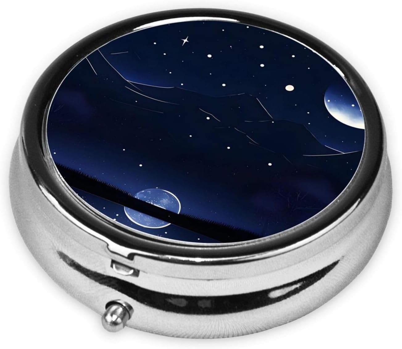 Serene blue night view Stay organized and stylish with this Round Pill Box – a portable medicine storage container perfect for vitamins, supplements, fish oil, and more. Designed with a full-print exterior, this pill box is not just functional but also a fashionable addition to your daily routine. Made from durable electroplated metal iron, it offers a premium feel and long-lasting performance.