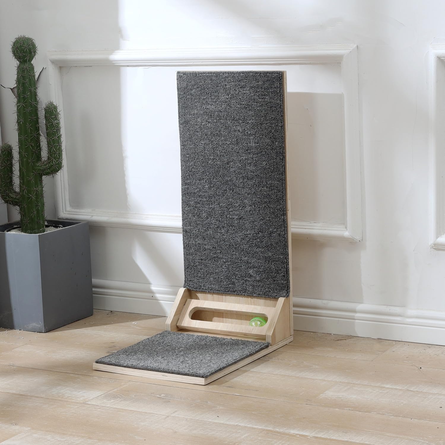 【ECO-FRIENDLY】The cat scratcher is covered with carpet material which is secured on the wooden board with hook and loop tapes, and the carpet mat is replaceable.