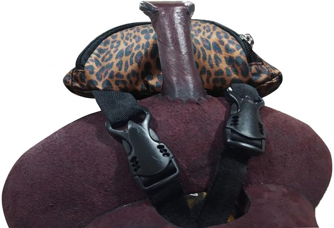 Showman Cheetah Print Insulated Nylon Saddle Pouch. This saddle pouch is equipped with two (2) convenient pockets that are ideal for your phone, keys, money, snacks, etc. Simply clip the saddle pouch to the pommel of your saddle with two (2) buckles. Measures 8 1/2″ long by 3 1/2″ wide by 4 1/2″ tall.