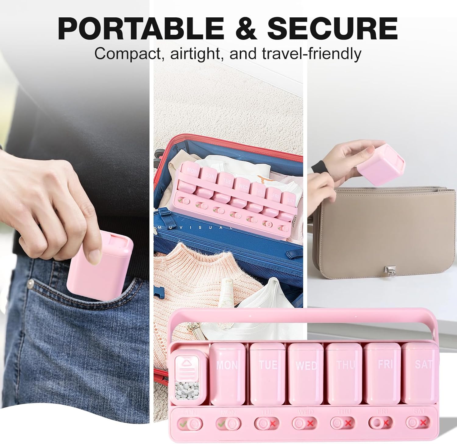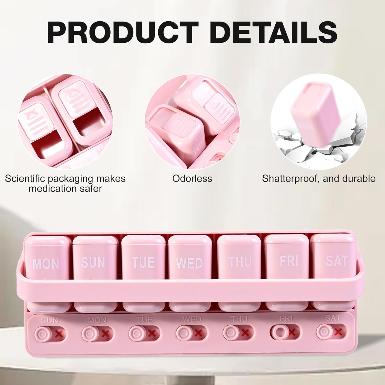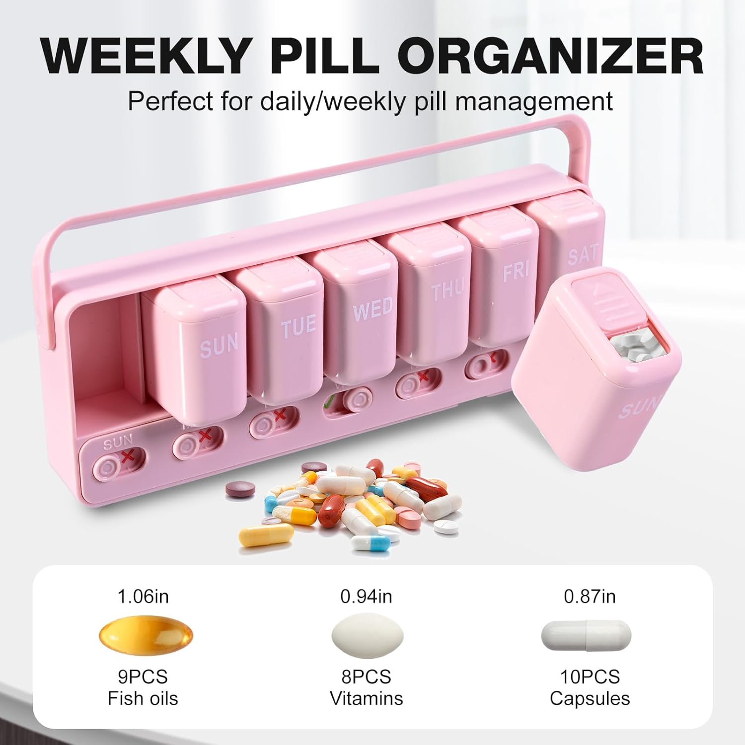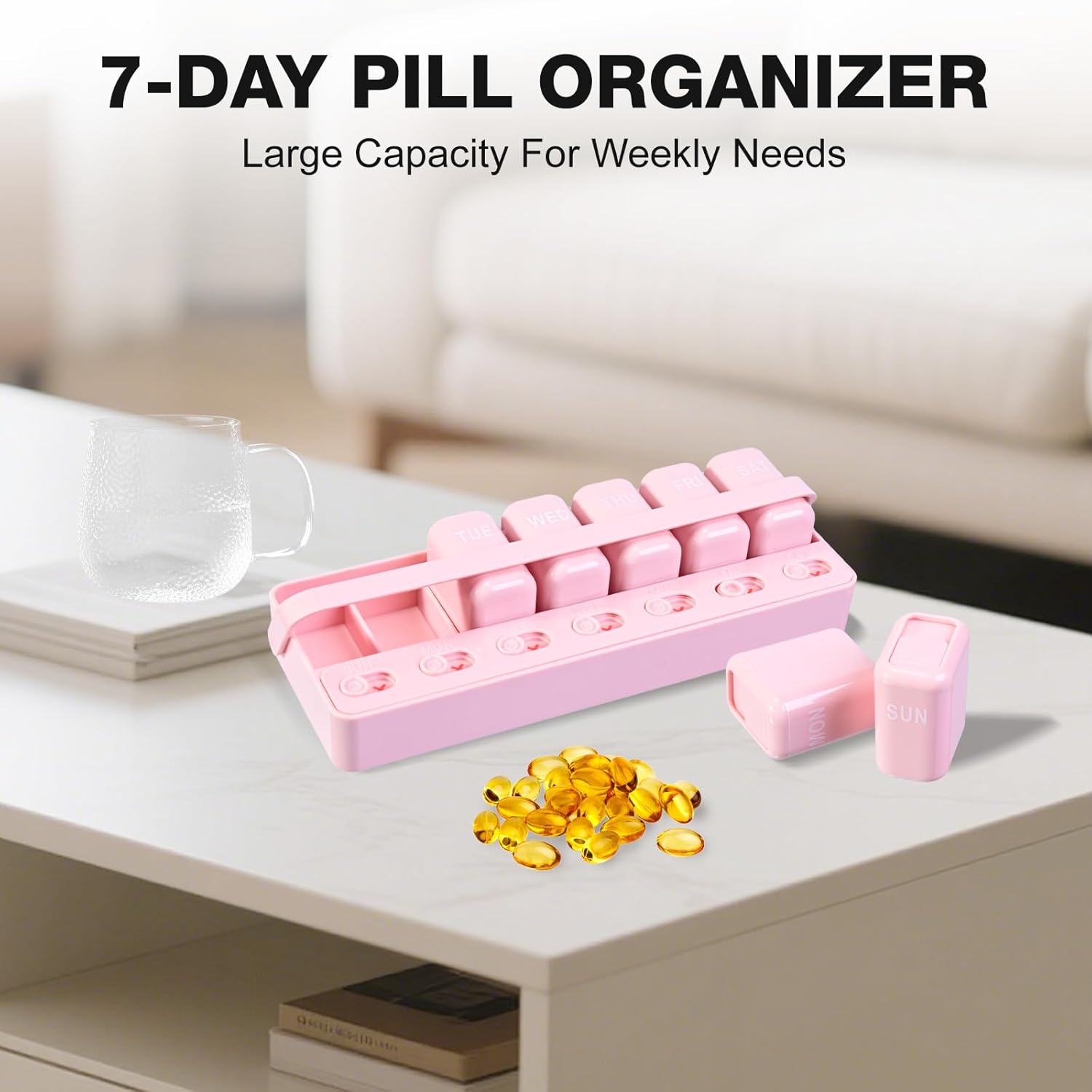 Sliding Lid Pill Organizer 7 Day Weekly Pill Box with 7 Detachable Containers, Leakproof Portable Medicine Case for Vitamins, Fish Oil, Supplements (Pink)