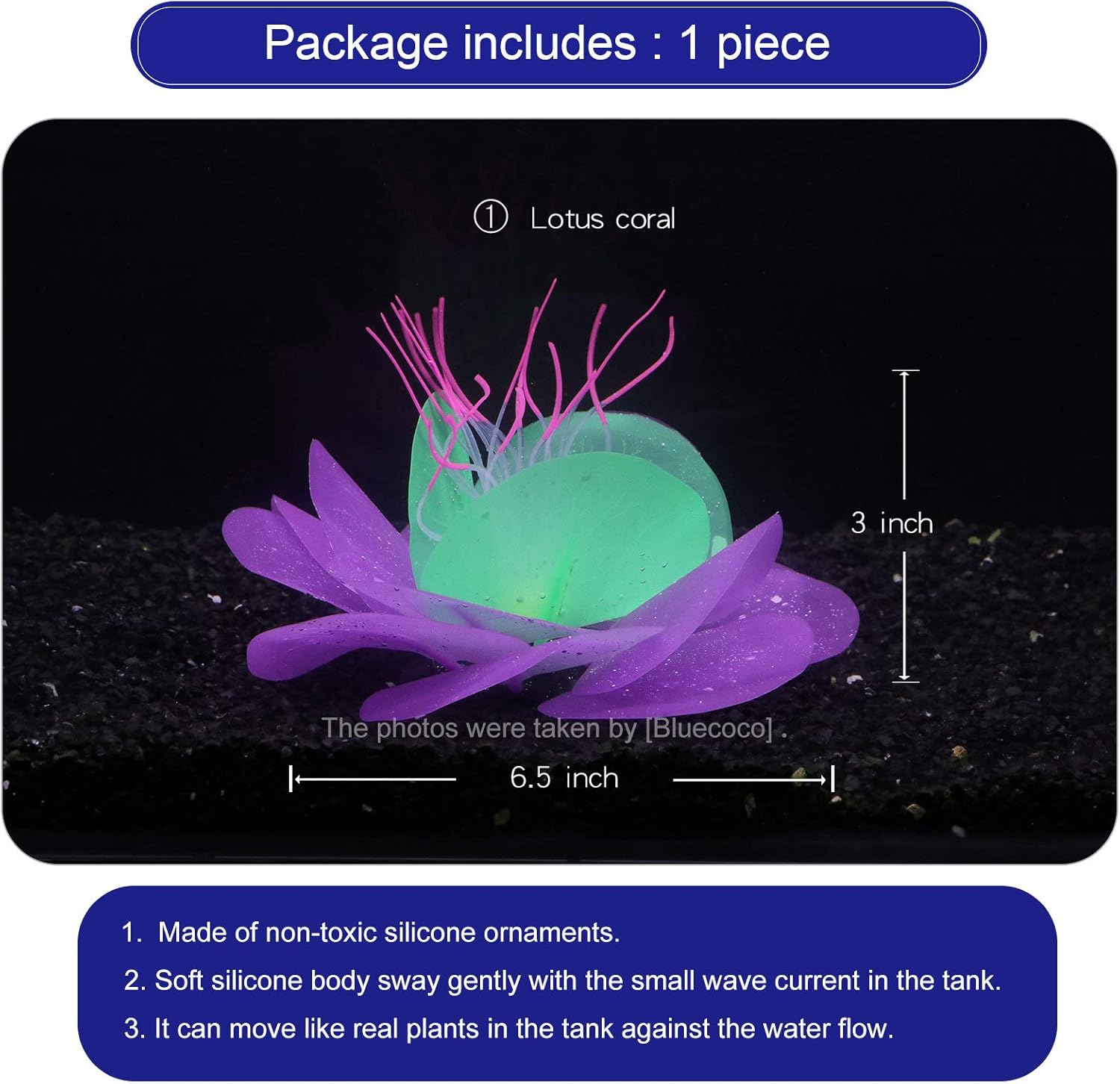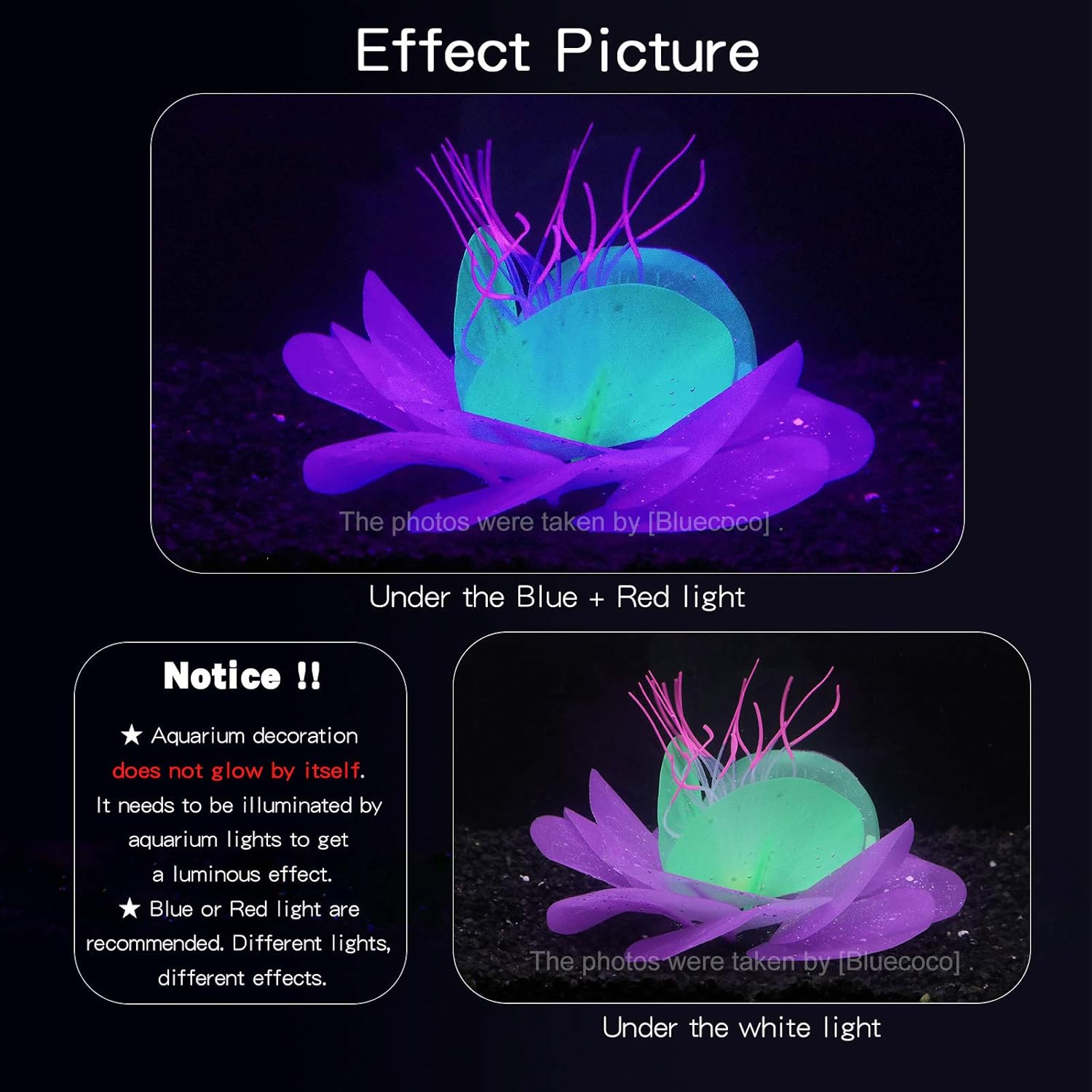 【Note!!!】Aquarium decoration does not glow by itself. It needs to be illuminated by aquarium lights to get a luminous effect.Blue or Red light are recommended.