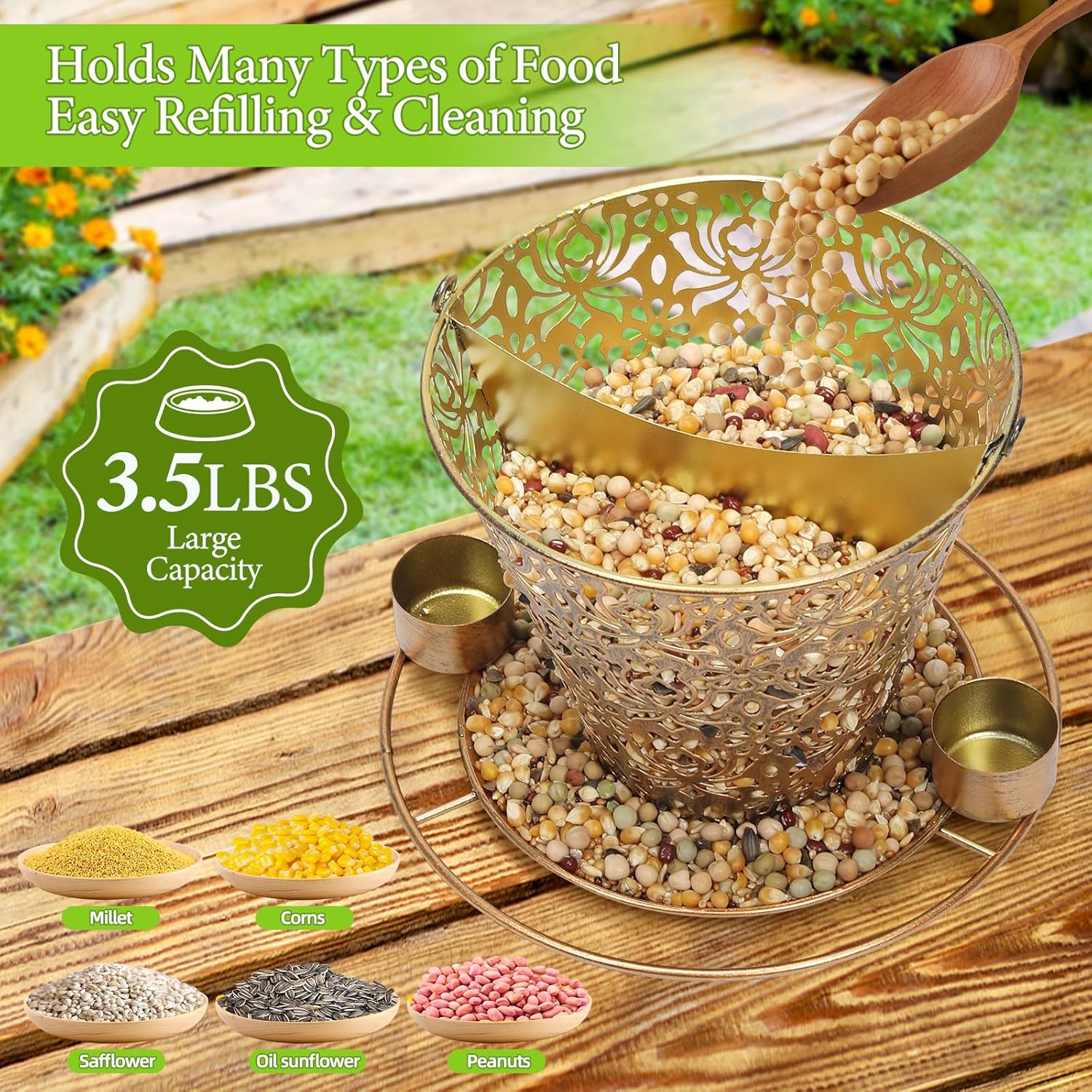 This wild bird feeder crafted from all-metal and reinforced with rust-proof hooks, this feeder withstands harsh sun, rain, and snow. The sturdy hanging chain ensures stability, while the quick-lock base makes refilling a breeze—no tools required!