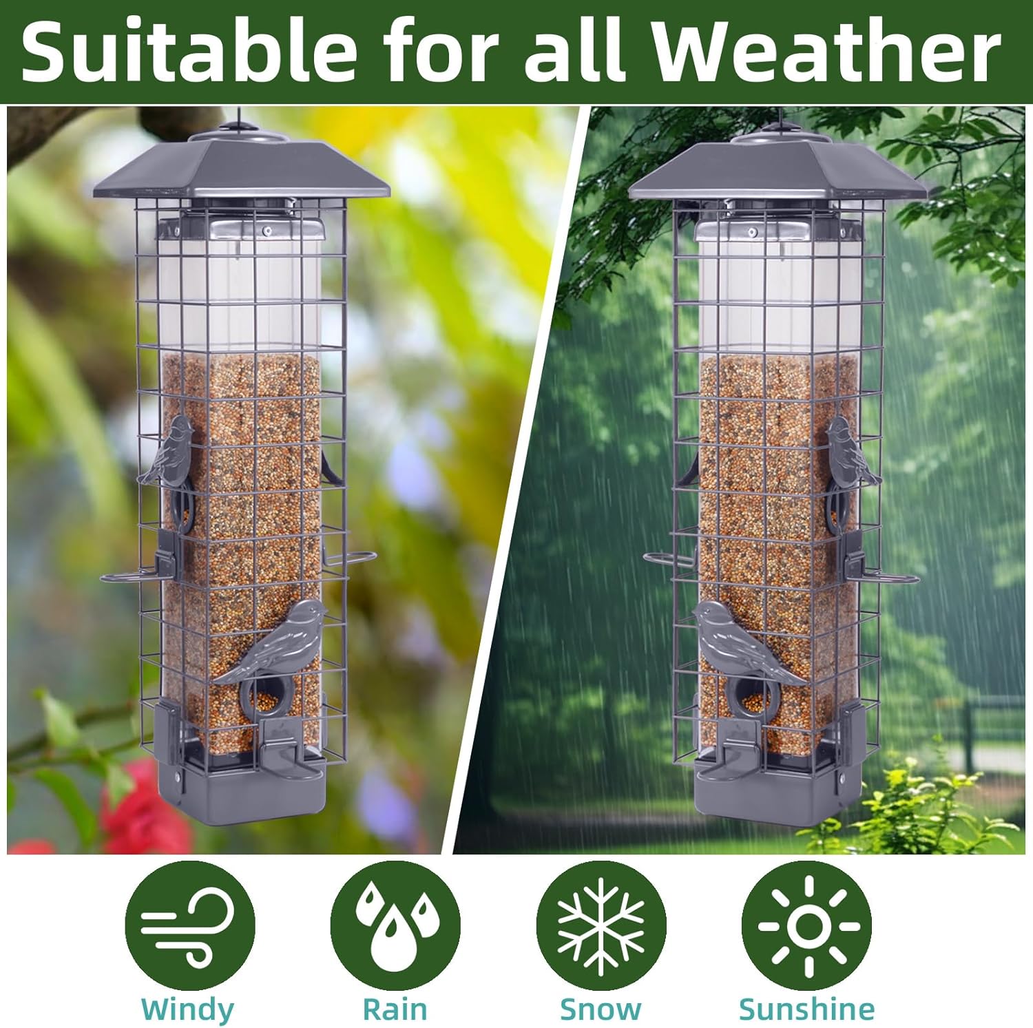 Squirrel Proof Bird Feeders for Outdoors: Bird feeder has a built-in weight activated spring, after the squirrel climbs up, the feeding port will close