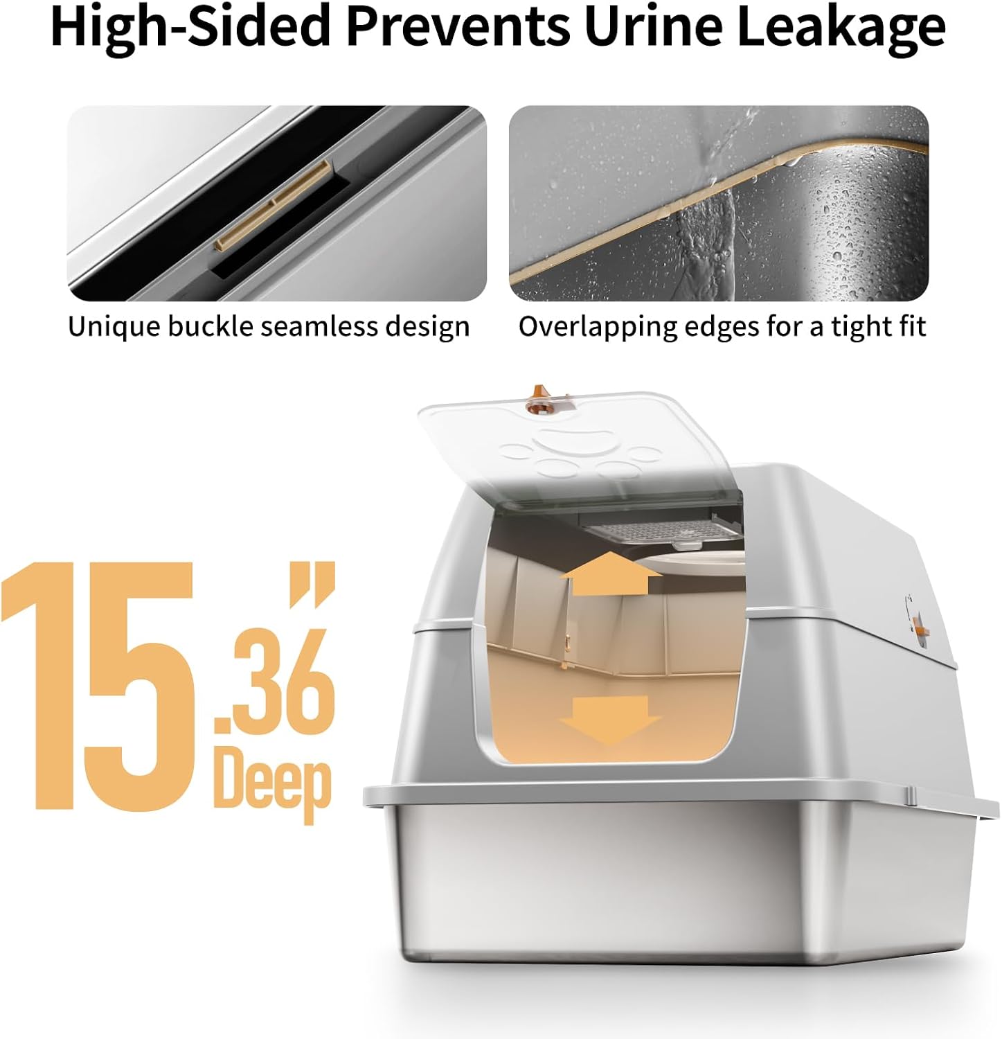 【Anti-Leakage Urine】Eosarcu stainless steel top entry cat litter box with high sides removable lid, its unparalleled containment effectively preventing urine leakage and odors from spreading out. also you can choose two modes (semi-enclosed or enclosed) based on your pets preference.