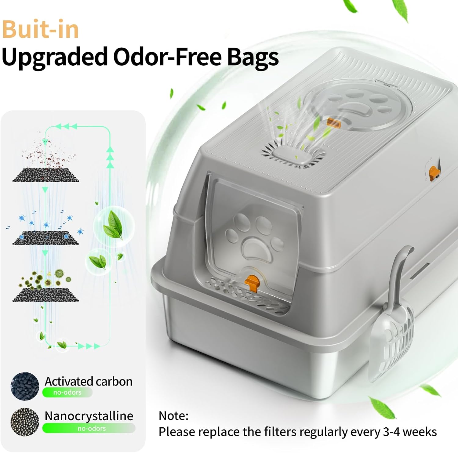 【Odor-Free】Eosarcu enclosed cat litter box features carbon filters to absorb odor effectively, ensuring an fresh and comfortable space for cats. We suggest to replace the carbon bags regularly every 3-4 weeks, pls go to the Eosarcu brand store to purchase.