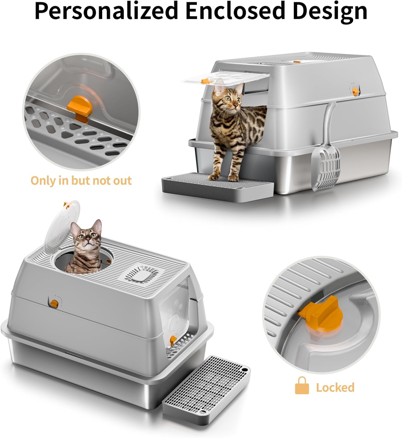 Stainless Steel Cat Litter Box with Lid, XL Large Enclosed High Sided Litter Box with Removable Lid, Carbon Filters -Odor Free, Easy Cleaning, Anti-Urine Leakage for Big Cats/Multiples-Grey