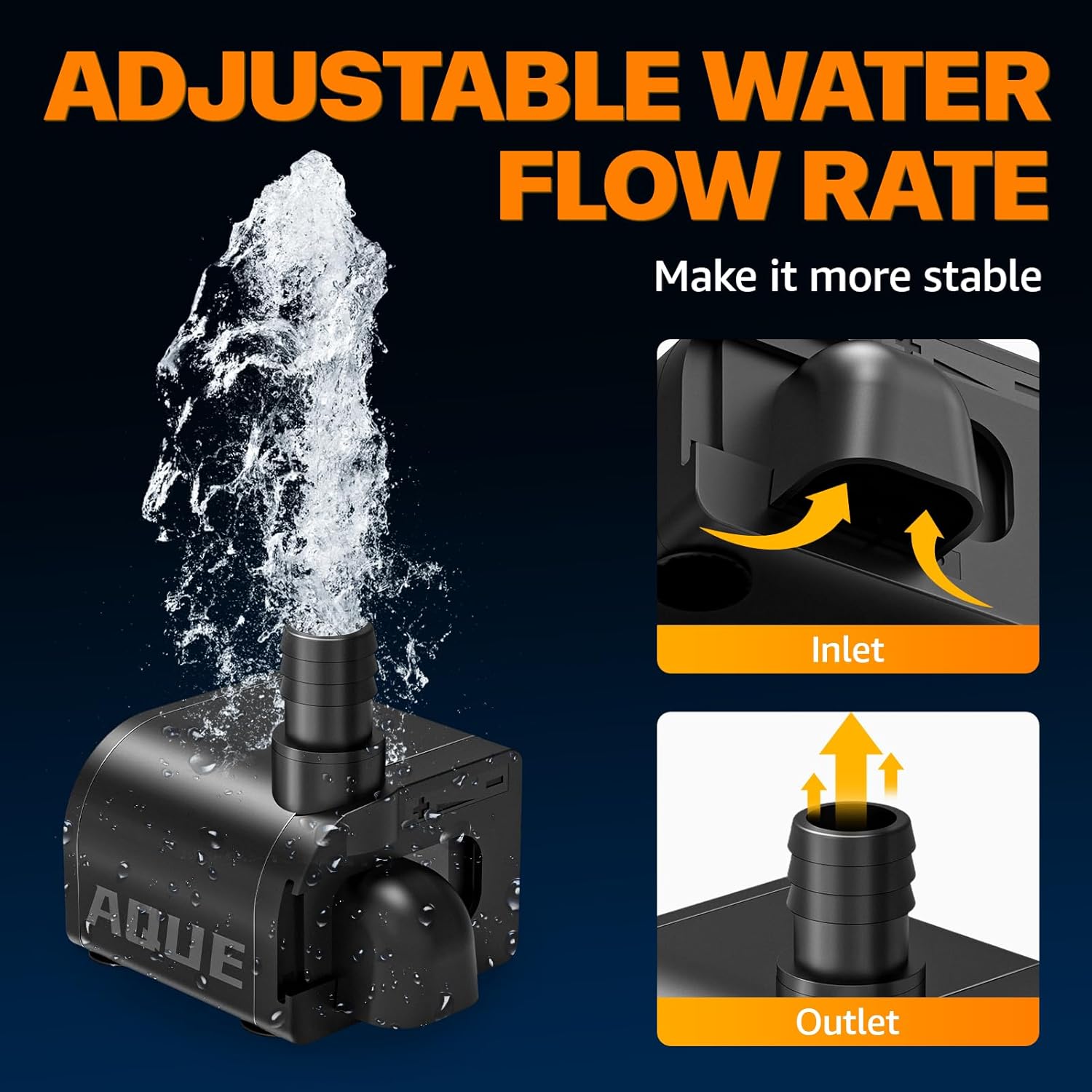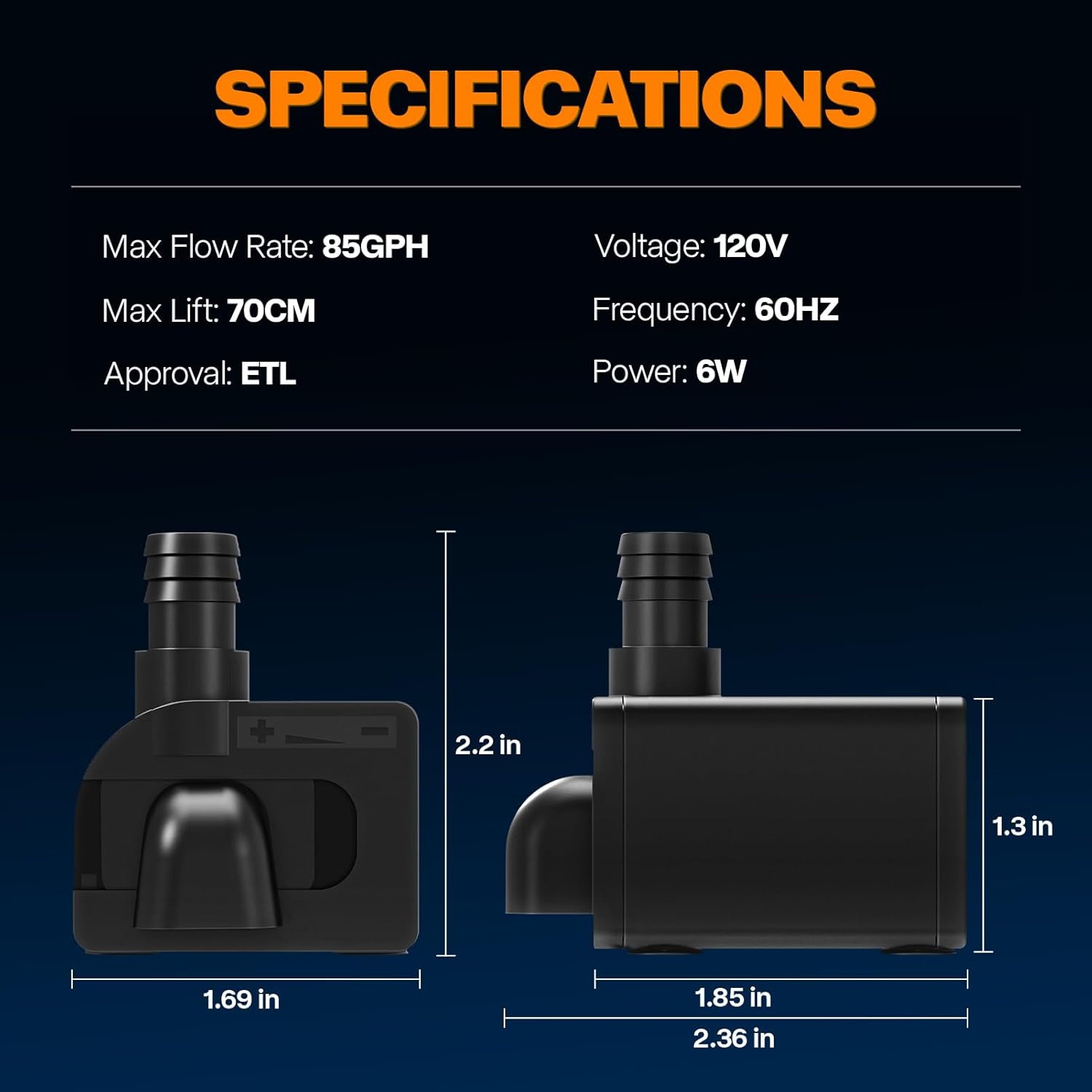 Submersible fountain pump, an ultra-quiet water pump with a filter screen. 85GPH,120V 60HZ, features a detachable design, and is suitable for fish tanks, aquariums, hydroponic systems, and fountains.