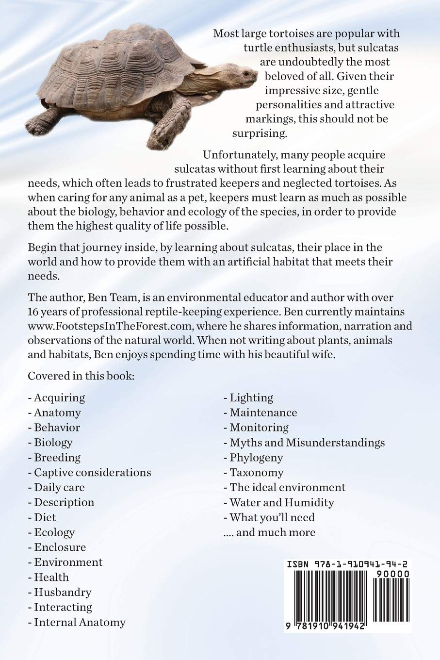 Most large tortoises are popular with turtle enthusiasts, but Sulcatas are undoubtedly the most beloved of all. Given their impressive size, gentle personalities and attractive markings, this should not be surprising. Unfortunately, many people acquire sulcatas without first learning about their needs, which often leads to frustrated keepers and neglected tortoises. As when caring for any animal as a pet, keepers must learn as much as possible about the biology, behavior and ecology of the species, in order to provide them the highest quality of life possible. Begin that journey inside, by learning about sulcatas, their place in the world and how to provide them with an artificial habitat that meets their needs. The author, Ben Team, is an environmental educator and author with over 16 years of professional reptile-keeping experience. Ben currently maintains www.FootstepsInTheForest.com, where he shares information, narration and observations of the natural world. When not writing about plants, animals and habitats, Ben enjoys spending time with his beautiful wife. Covered in this book: – Acquiring- Anatomy- Behavior- Biology- Breeding- Captive considerations- Daily care- Description- Diet- Ecology- Enclosure- Environment- Health- Husbandry- Interacting- Internal Anatomy- Lighting- Maintenance- Monitoring- Myths and Misunderstandings- Phylogeny- Taxonomy- The ideal environment- Water and Humidity- What you’ll need…. and much more