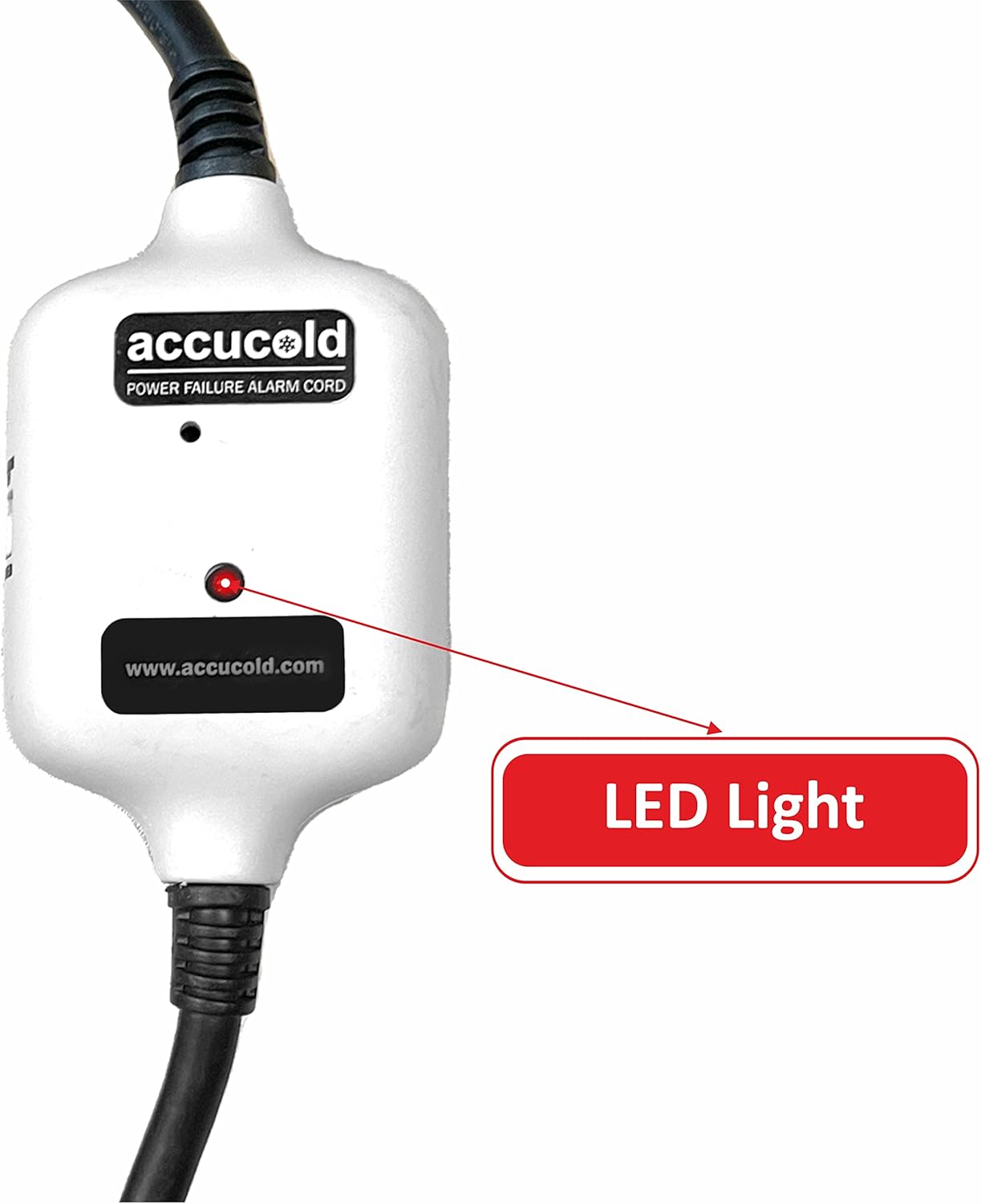 This ACCUCOLD power-failure line cord has a built-in power failure sensor with an 80dB loud audible alarm. It is intended for monitoring essential 120-volt AC-powered cord-connected appliances for power failure events, accidental cord disconnection, and circuit breaker failure. The loud signal sounds for up to 90 minutes, advising the user to reconnect power to the device. Perfect for Monitoring Refrigerators, Freezers, Sump Pumps, and Aquariums.