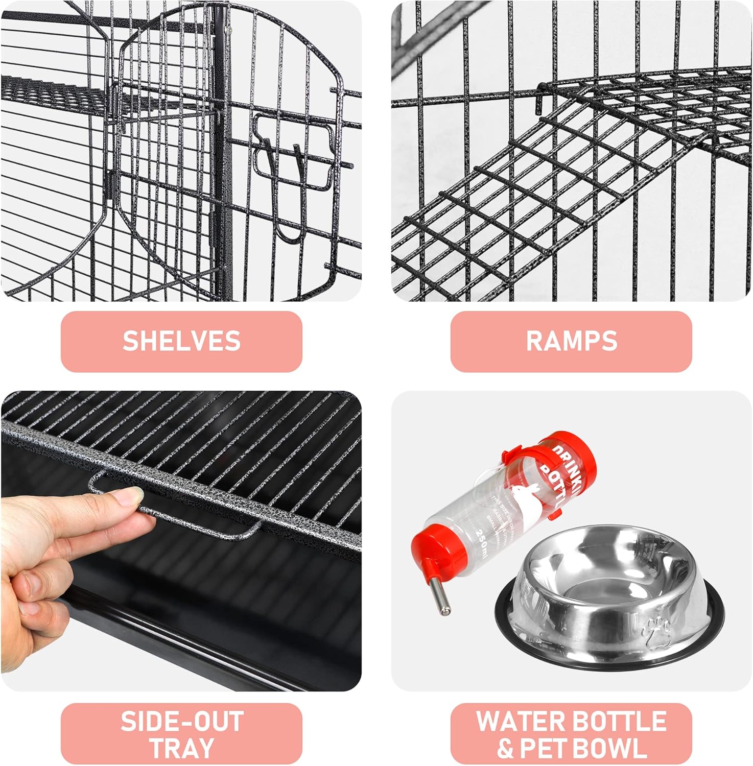 CONVENIENT & FOLDABLE: 4 Level with ramps provides enough space for pets to live and have fun. Use the built in shelf to store extra toys or treats. Comes with shelves, ramps, easy-to-clean tray, water bottle and pet bowl. Easy to be folded for storage and carrying without occupying much space. Warm Note: Please make sure to check the bar spacing is suitable for your pet before purchasing.
