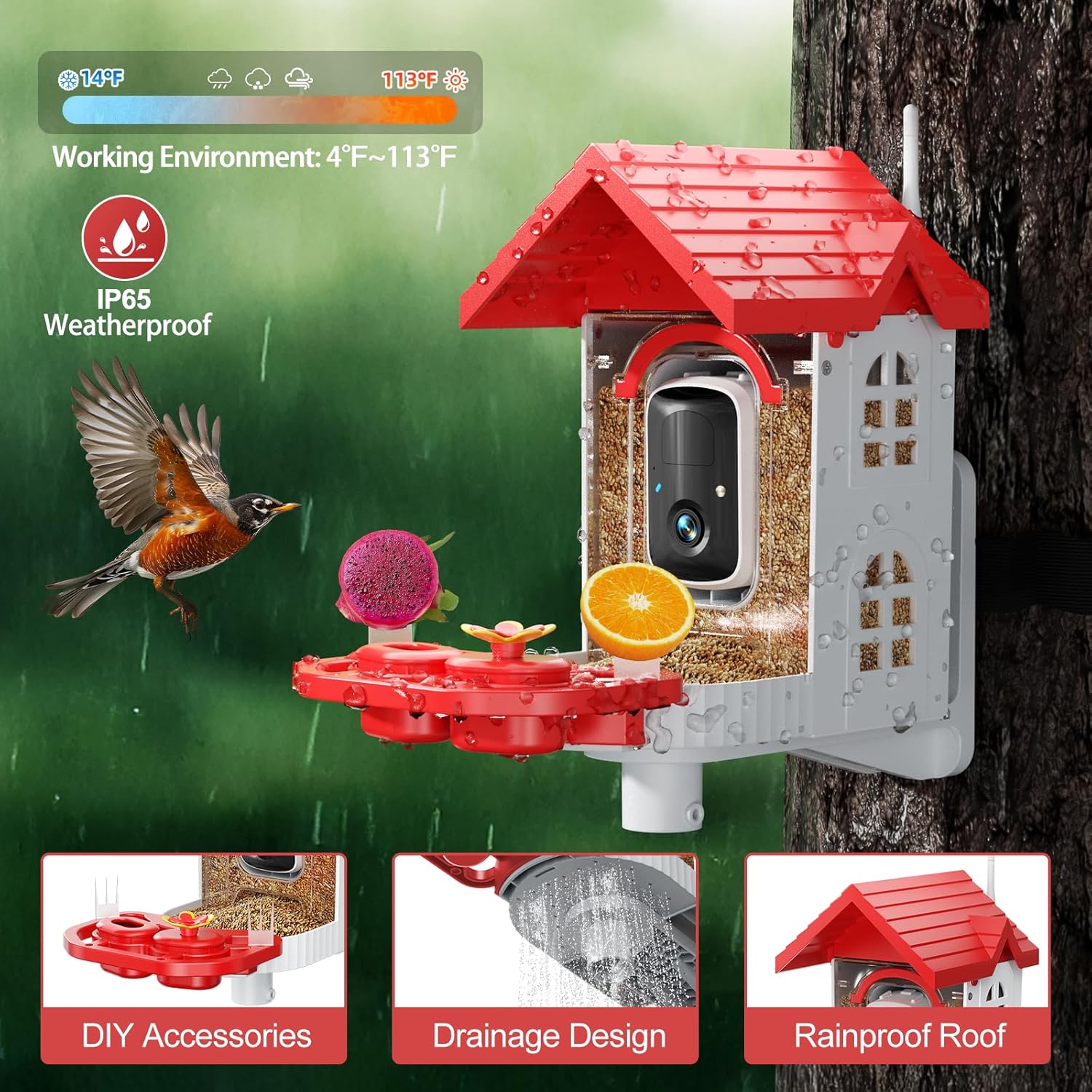 【Feathered Feast–DIY Add-ons】This camera bird feeder includes nectar/water feeders, fruit forks. You can DIY various delicious foods for your feather friends,which will attract various bird species, enhancing your birdwatching experience.