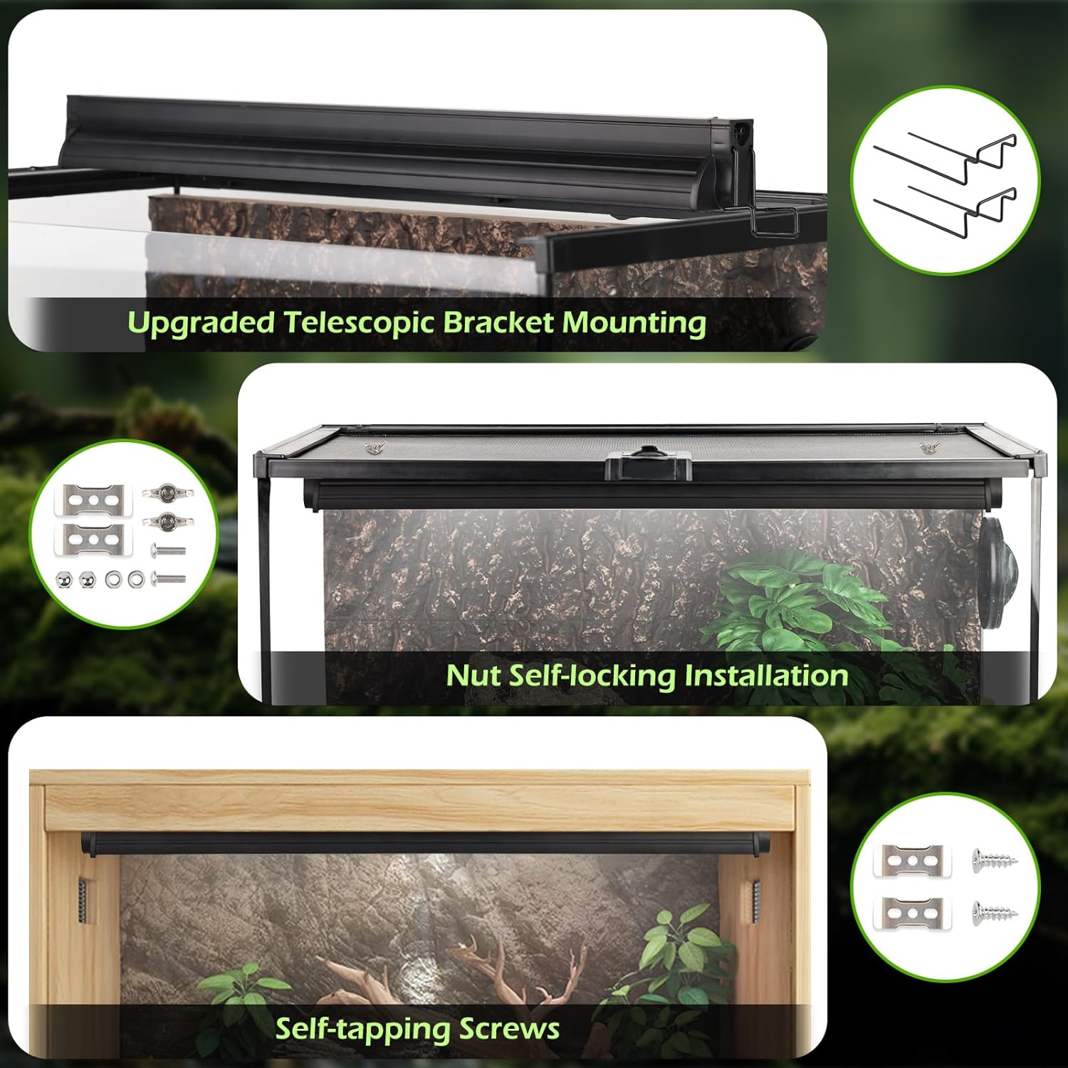 Easy Installation: the terrarium light has 3 ways to install, nut self-locking installation, self-tapping screws, and an upgraded telescopic bracket mounting (24W is 23-30″ terrarium, 8W is 11.8-19.7″ terrarium)
