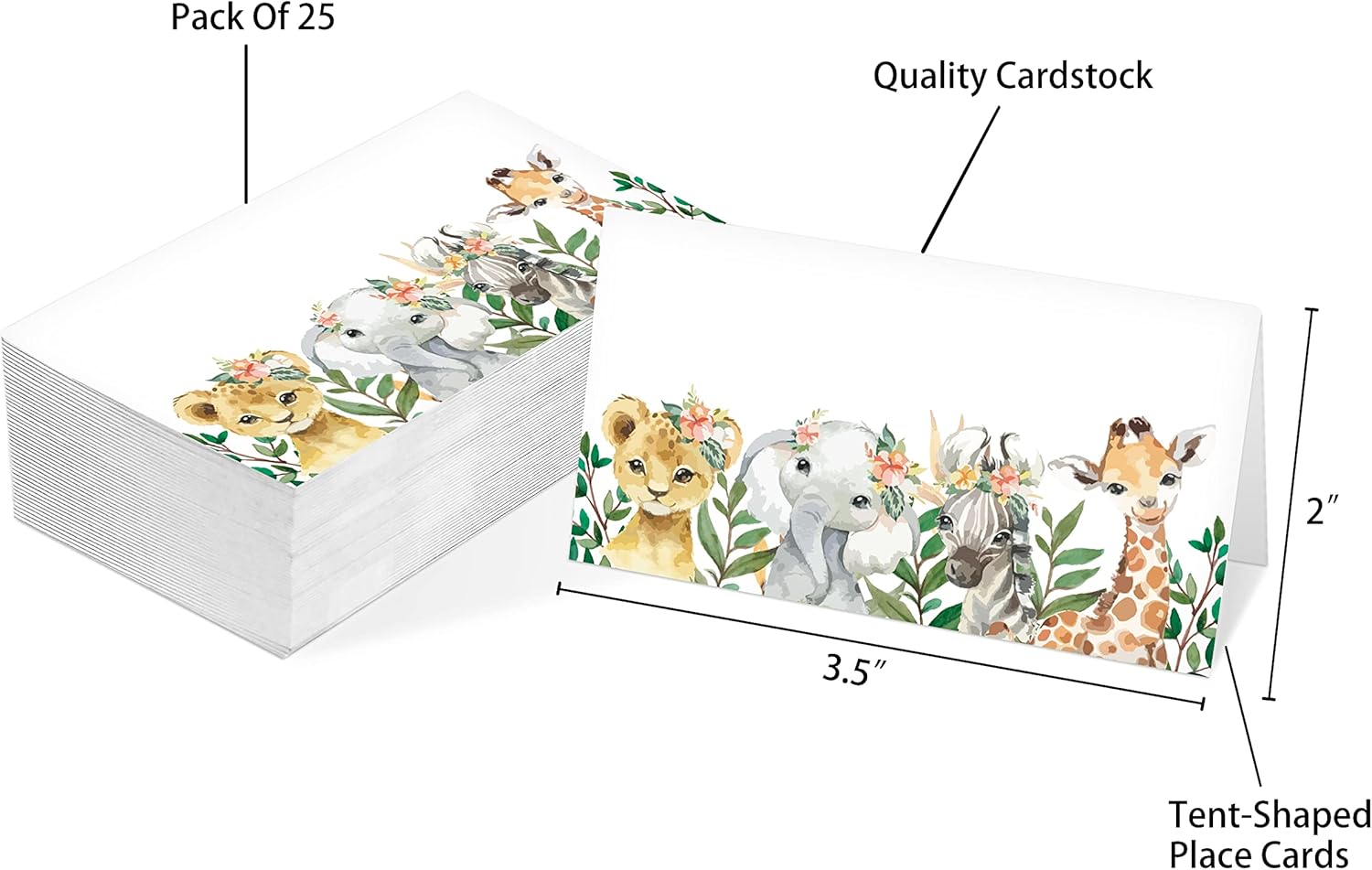 Table Place Card, Jungle Safari Animals Themed Tent Style Cards, Pack of 25 Half-Fold Reception Place Card, Wild Animal Food Labels, Perfect for Baby Shower, Birthday Party C03