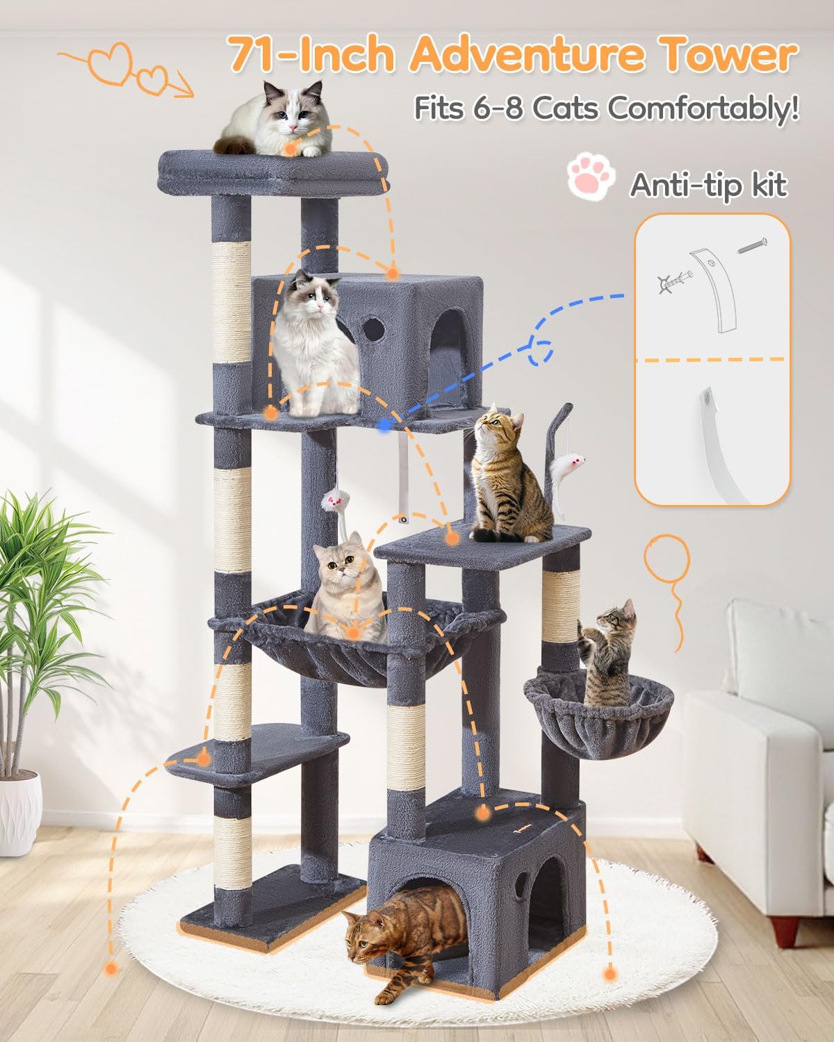 Taoqimiao Heavy Duty Cat Tree for Large Cats 20lbs+, 71 Inches Tall Cat Tower, 2 Cat Condo with 6 Scratching Posts, Super Large Hammcock, Cat Toys, Cozy Basket, Smoky Gray, MS037G