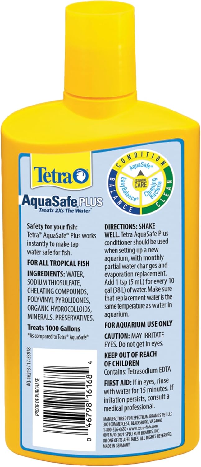 Tetra AquaSafe® Plus works instantly to make tap water safe for fish in freshwater and marine aquariums. This BioExtract formula contains natural biopolymers to support the development of beneficial filter bacteria for healthy and clear water. These added ingredients help reduce aquarium pollution by strengthening the bacterial bed. Tetra AquaSafe Plus provides a slime coating to help wounds heal and protect fish from abrasions. Unique colloid ingredients protect your fish’s delicate gills and membranes. Use with freshwater or marine fish. Add 1 teaspoon (5 mL) for every 10 gallons of aquarium water. Top of bottle cap can be used for measuring – fill to inner ring-line to treat 10 gallons or use one full capful for 20 gallons. Make sure that replacement water is the same temperature as water in aquarium. Tetra AquaSafe Plus is not a medication and is not intended to be a substitute for any medication. Since 1951, Tetra has developed the world’s most comprehensive body of fish food knowledge, and fishkeeping enthusiasts have looked to the brand for products and solutions that add ease and beauty to their home. Whether you’re an experienced hobbyist or just starting out, Tetra has everything you need–-from a large variety of quality fish food and innovative equipment to test kits and decor.