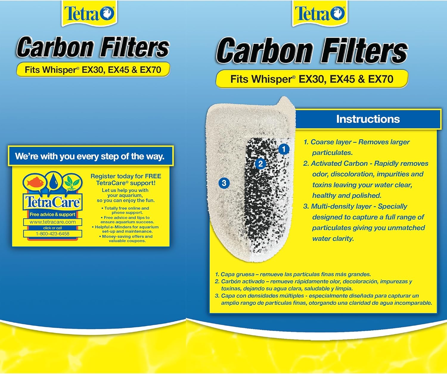 For 50 year, fishkeeping enthusiasts have looked to the Tetra name for products and solutions that add ease and beauty to their home. Whether you’re an experienced hobbyist or just starting out, Tetra has everything you need–-from a large variety of quality fish food and innovative equipment to test kits and decor. Keep your water crystal clear for healthier fish with these ready to use carbon filters. This pack of large carbon filters fit Whisper EX30, EX45 and EX710 filters. Finally a Carbon Filter as innovative as the Whisper EX Filtration System it’s designed to fit. Tetra Carbon Filters’ layers of multi-density floss effectively trap even the smallest particulates while activated carbon rapidly eliminates odor, discoloration, impurities, and toxins. The coarse layer removes larger particulates, the activated carbon rapidly removes odor, discoloration, impurities and toxins, while the multi-density layer captures a full range of particulates. The result is water that’s clear, healthy, and polished.