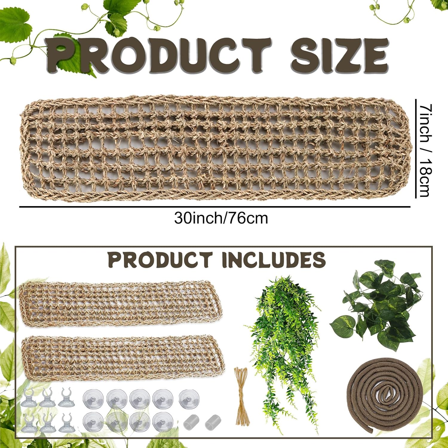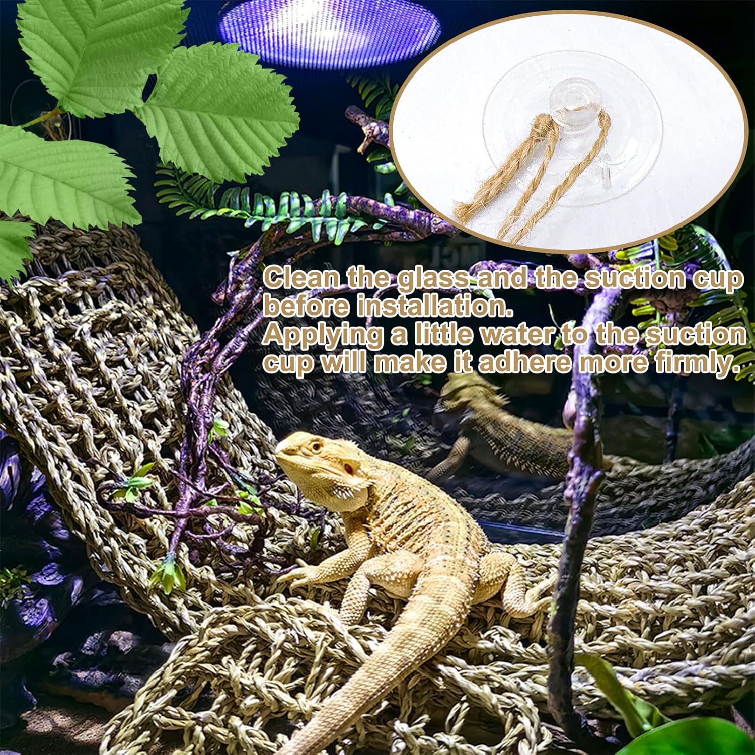 Tfwadmx 2Pcs Large Bearded Dragon Hammock Lizard Lounger Natural Seagrass Fiber Reptile Habitat Decor with Leaves Rattan Plant for Geckos Snakes