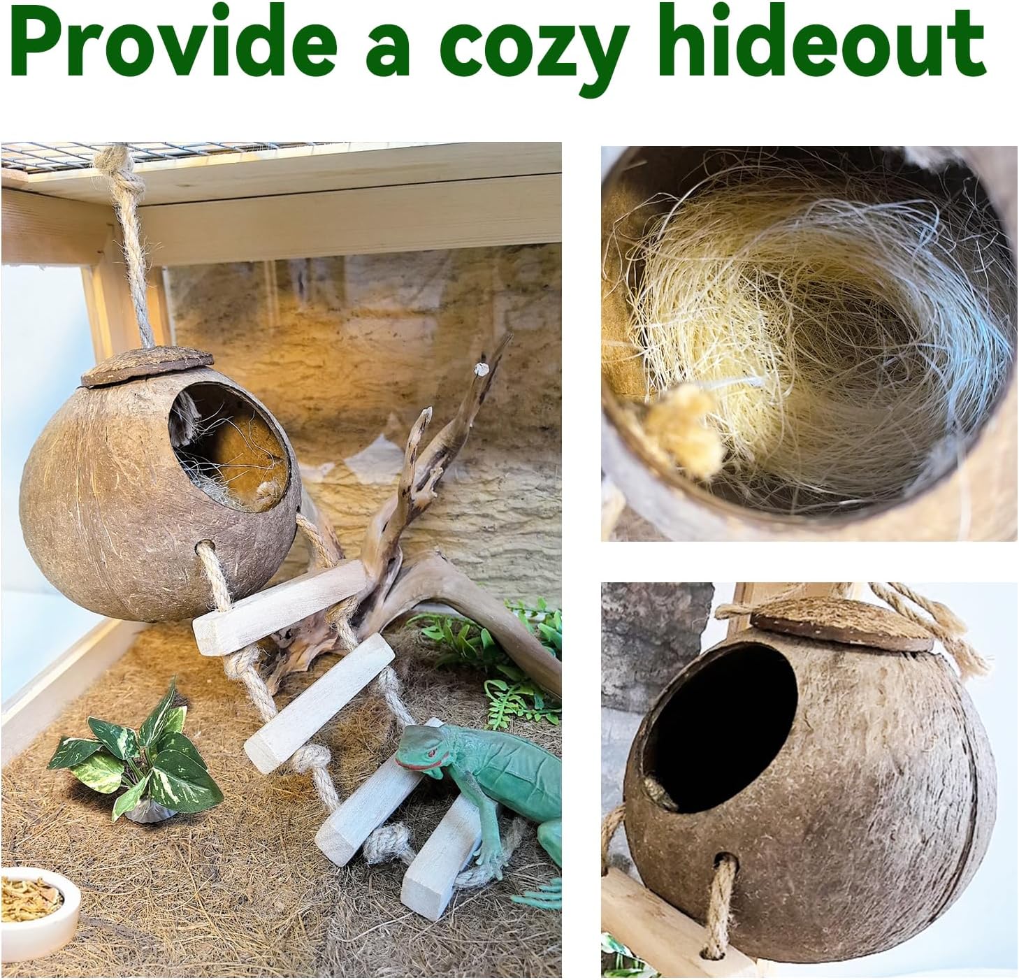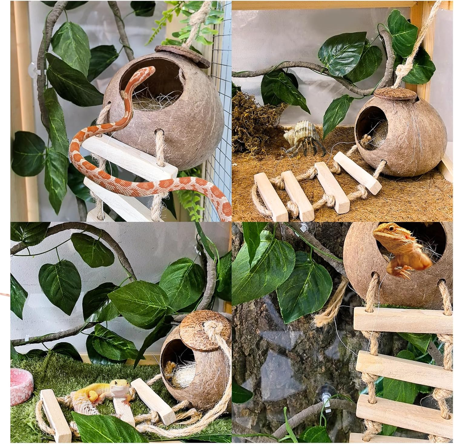 Tfwadmx Crested Gecko Coconut Hide,Leopard Gecko Coco Hut Hideout Cave with Ladder,Reptile Hanging Coconut Hut & Climbing Vine,Ideal Habitat Accessory for Hermit Crab, Snake,Lizard
