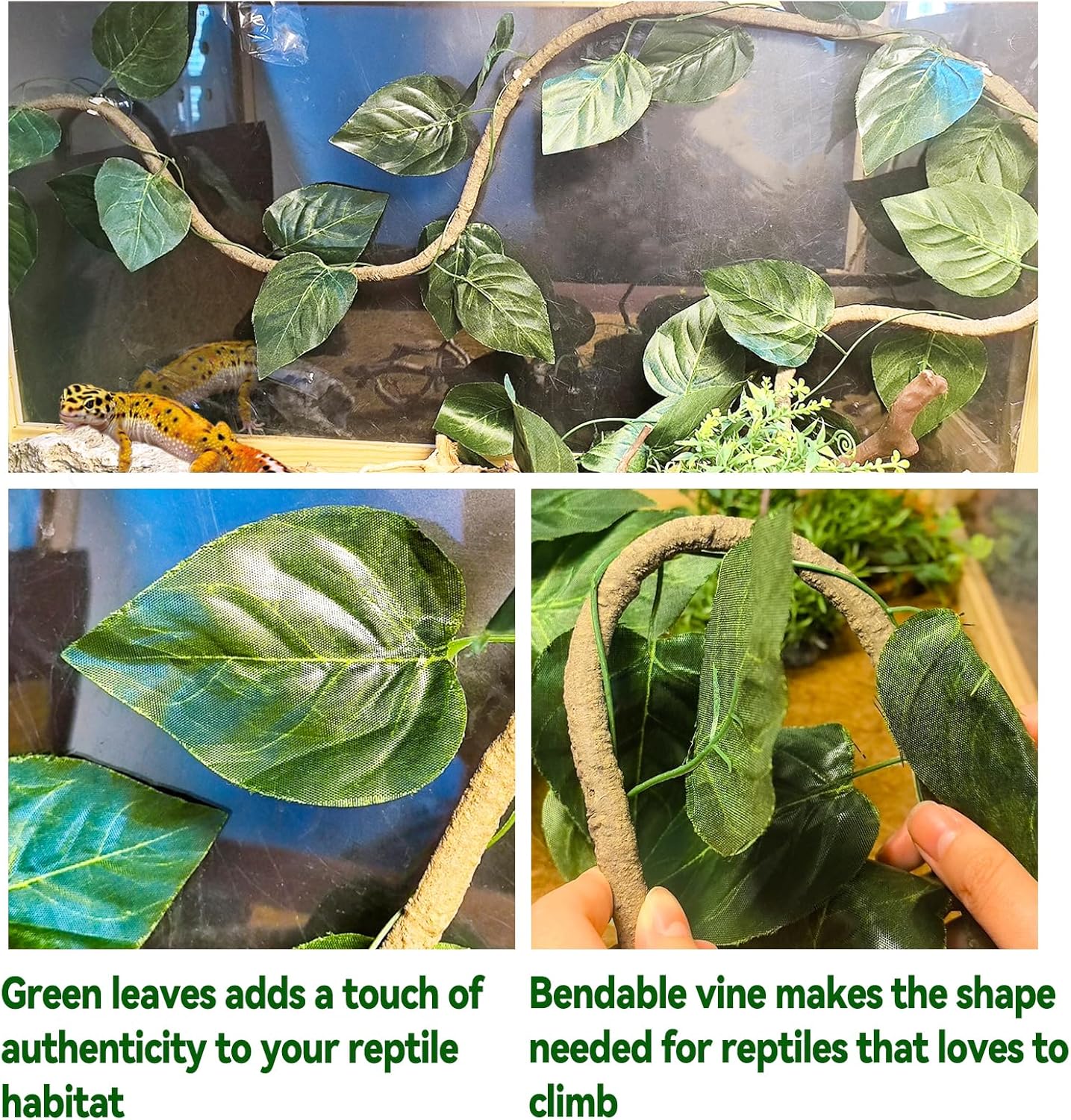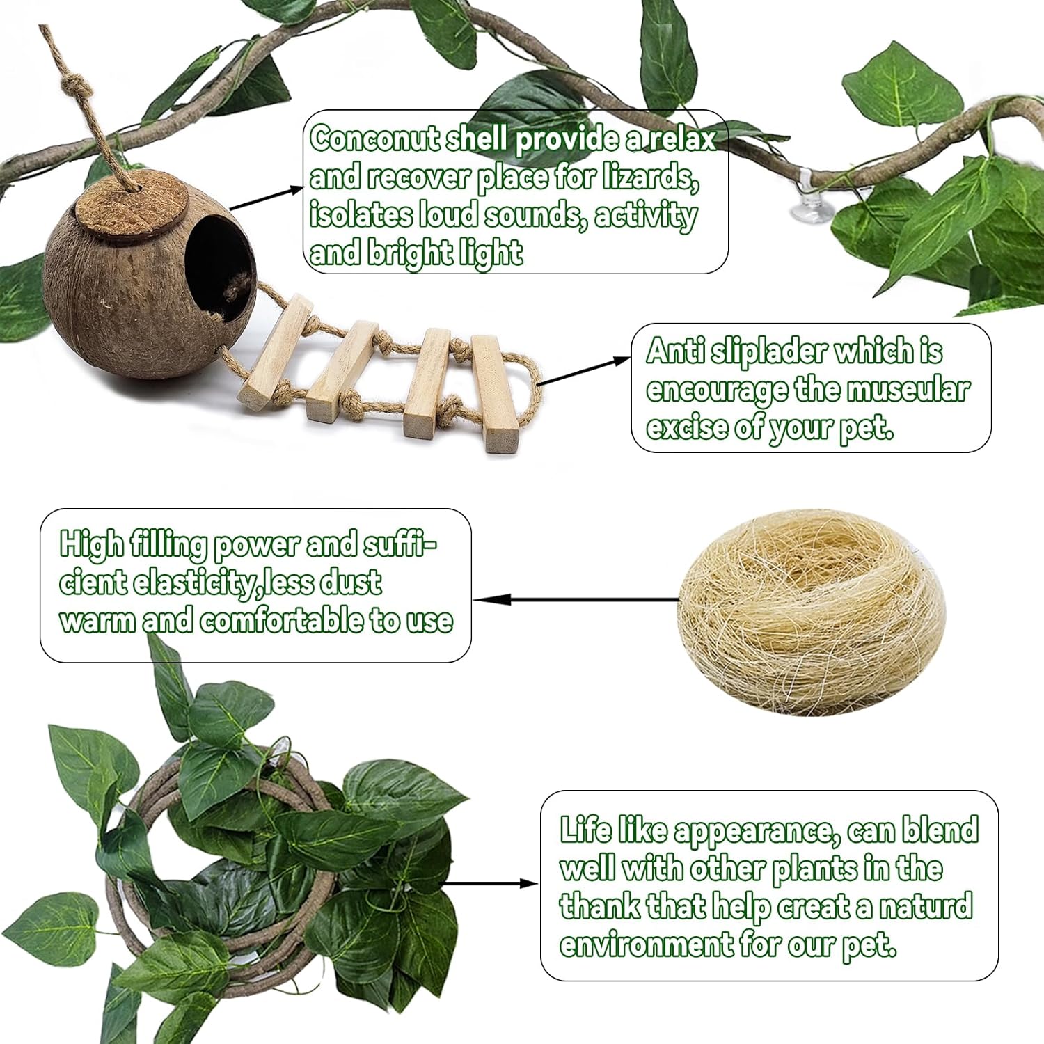 【Easy to use】 You can choose to hang the coconut hide for reptiles in the tank with the rope, or place it directly in the tank, very simple. Decorative leaves can be wrapped around rattan and attached to terrarium walls with suction cups.
