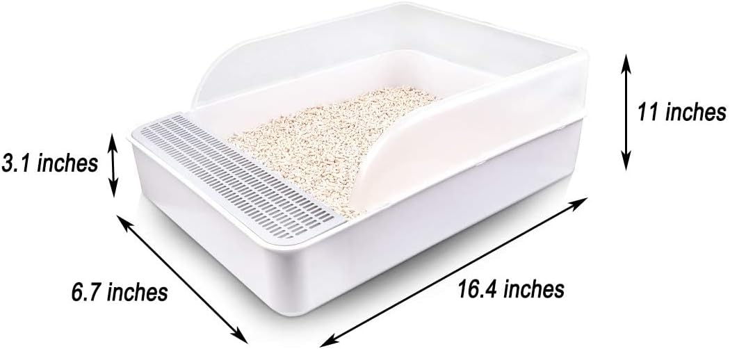 The litter box is very easy to clean because there’s no grate and you can just wipe out the dirt etc. However, the design of the gray part to catch loose particles is not very ideal. My rabbit just hopps over it of course and I’m pretty sure a cat will do the same, thus making that part just take up space. The splash guard is nice though, and does its job.