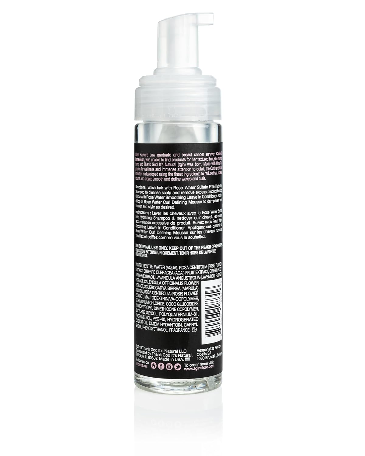 Rose Water Defining Mousse reduces hair loss, defines curls, and controls frizz. Provides a medium hold when styling for touchably soft, defined curls! Hair is left defined and shiny without the flake or crunch of traditional mousses.