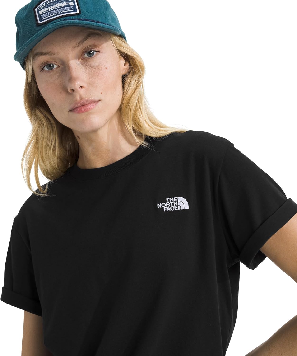 Very nice embroidered North Face tee in a cute color you can wear all year round. I love outdoor brands but sometimes the colors are too … I dont know, passive? This teal/blue is a more sturdy color.It is just kind of a basic square block tee with a crew neck. It is realllly soft and has a medium weight to it. It feels like one of those soft vintage t shirts that will age really well.The north face logo is embroidered with a white thread. Overall really happy with it! I got it for my daughter who wears anything from an extra small to an XXL. She is a tiny person and this fits her with some room so it is not tight.In my pictures, the full shot of the shirt shows it in full natural light from the window. When I zoomed in to the label it shows a closer representation of the darker teal color.