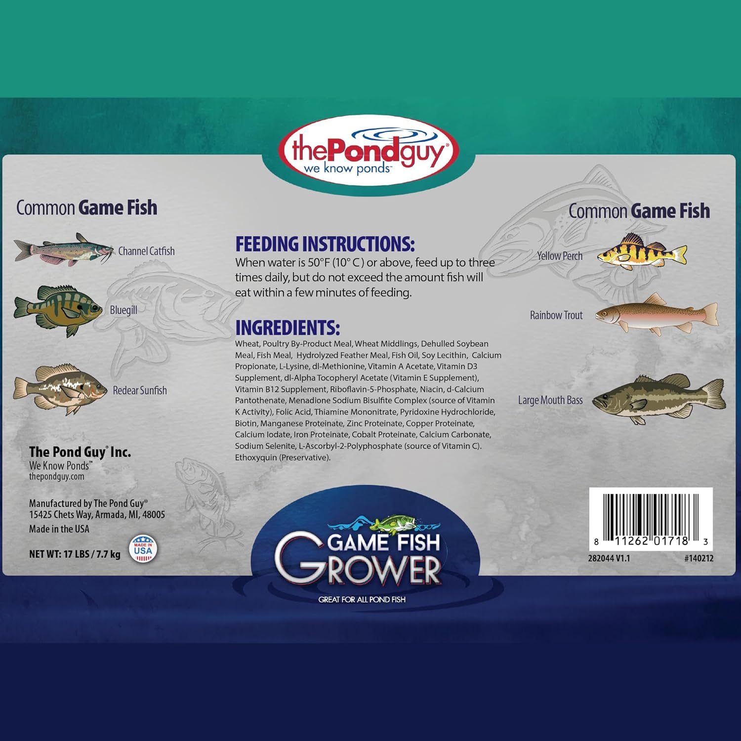 Is this fish food suitable for all fish types?The Pond Guy Game Fish Grower Fish Food is suitable for all warm-water game fish. This medium-sized pellet is great for all game fish, such as trout, bass, perch, sunfish, carp, bluegill, catfish, and more.Do these pellets sink or float?These are floating pellets.How often should I feed my fish?We recommend feeding your game fish up to two or three times per day but do not exceed the amount that fish will comfortably eat within a five-minute period. Feeding pond fish is recommended only when water temperatures are above 50°F (10°C).Does this fish food promote rapid fish growth?Yes, it promotes rapid fish growth. The Pond Guy Game Fish Grower Fish Food contains a minimum of 40% protein and a 10% minimum of fat, all formulated for fast fish growth.Is food easy to store and reseal?Yes, it is easy to store and reseal this fish food. The product comes in a 17-pound resealable bucket for easy storage. This helps keep the pellets fresh and allows you to reuse the container.Does the bucket protect the pellets from moisture/air?Yes, the bucket may be resealed which ensures moisture and air are not able to leak into the container.Is this food compatible with an automated fish feeder?Yes, at 3.0 mm this fish food would be great to use in an automated fish feeder. The Pond Guy KoiGrower works for koi as well as sport fish, ensuring your finned friends are consistently well nourished, no matter your schedule.