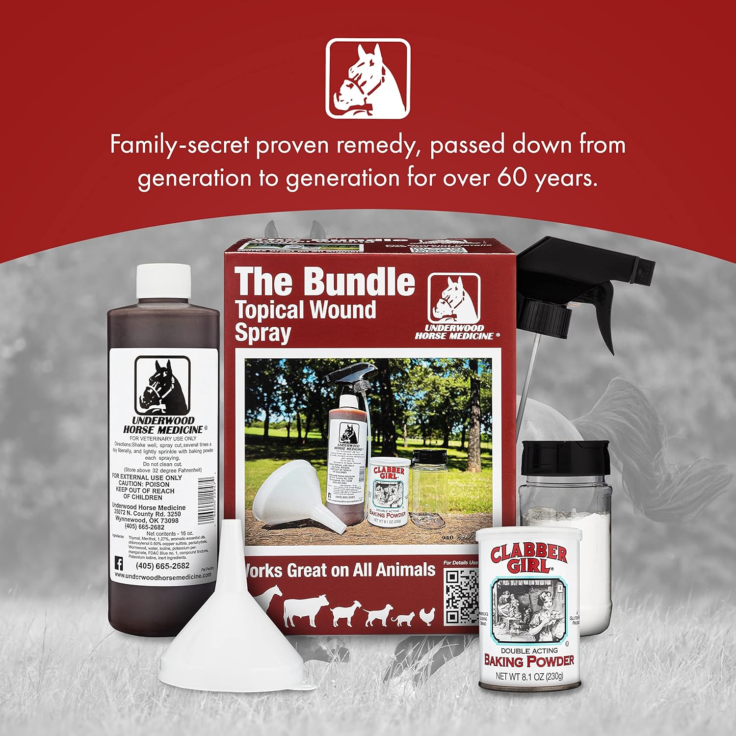 CONVENIENT WOUND CARE KIT – A powerful medication that can treat all types of external wounds – a horse first aid kit must have. This kit includes a 16 oz horse wound care spray bottle, baking powder, wide mouth funnel, and powder shaker.