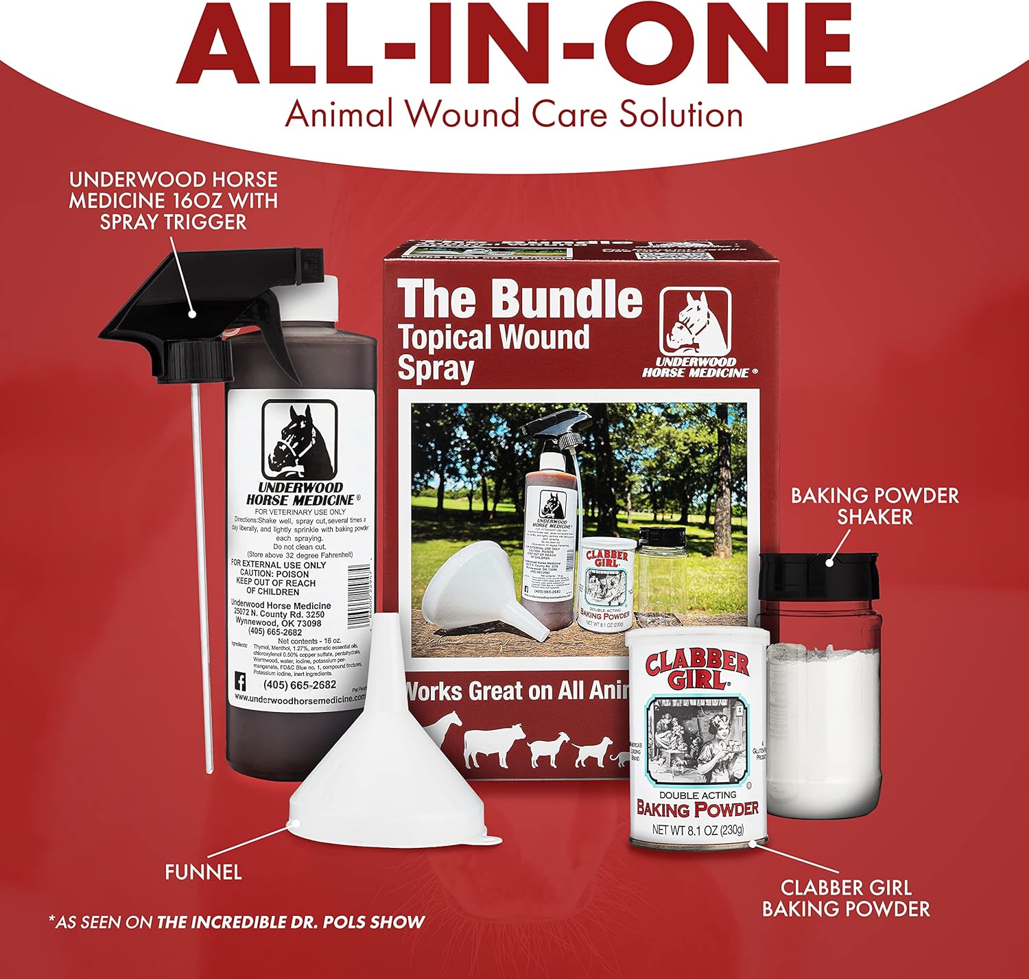 Topical Wound Spray Kit – 16oz Refill Bottle w/Baking Powder, Funnel, Spray Trigger & Shaker – Pet First Aid Kit – Equine First Aid Kit for Horses – Antiseptic Spray for Wounds – Horse First Aid Kit