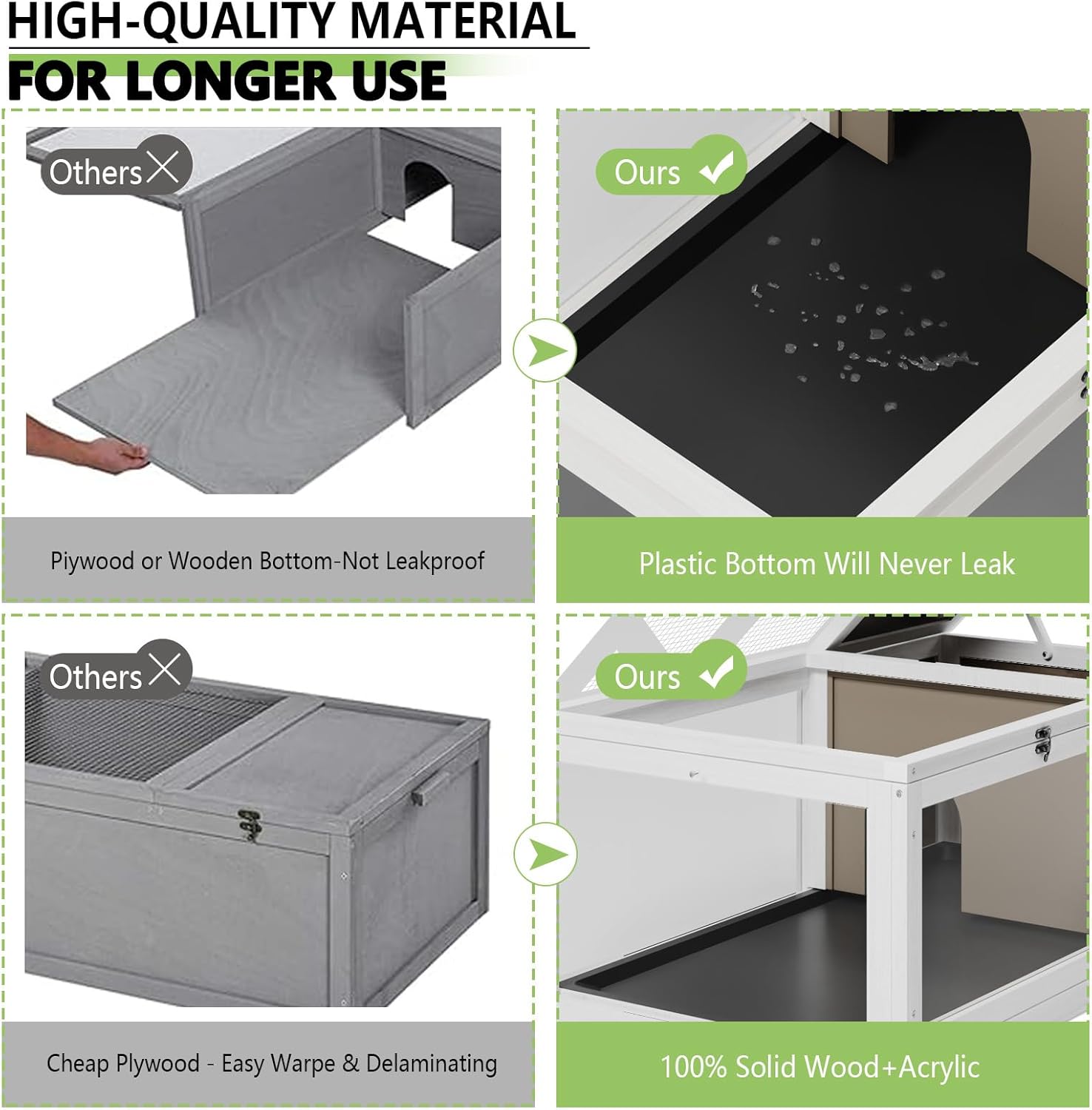 【Easy to Clean & Assemble】: The Tortoise Habitat is designed with a large removable plastic tray to prevent bottom rot, making maintenance hassle-free. With two operable top lids secured by wooden brackets, assembly takes only 20-30 minutes, ensuring convenience for pet owners
