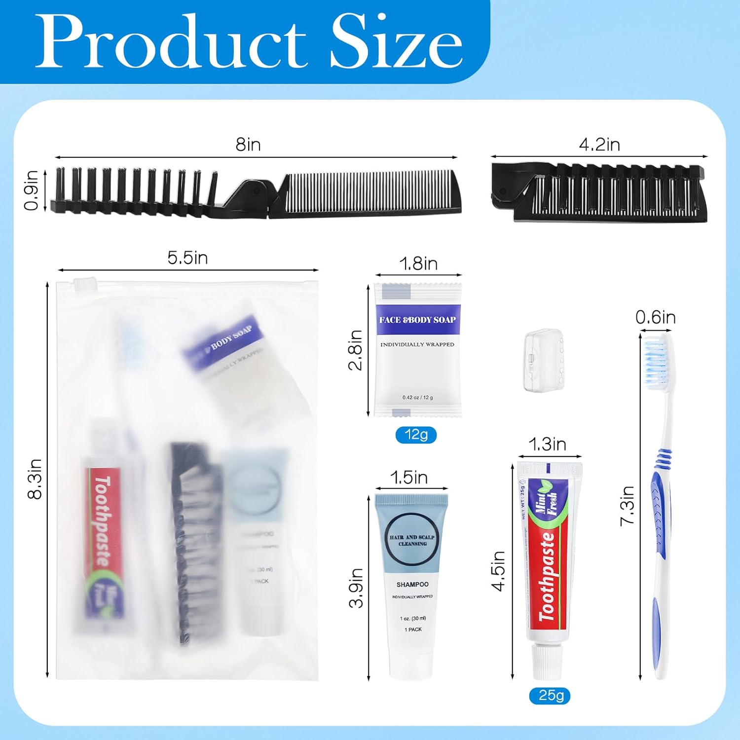 Basic Toiletry Kits : You will receive 40 toiletries sets, each includes 1 x blue toothbrush with 0.88oz / 25g toothpaste, 1 x 1oz / 30ml shampoo, 1 x 0.42oz / 12g soap, 1 x black folding comb, covering on-the-go personal basic care need, everything you need is neatly packed in one convenient travel size package