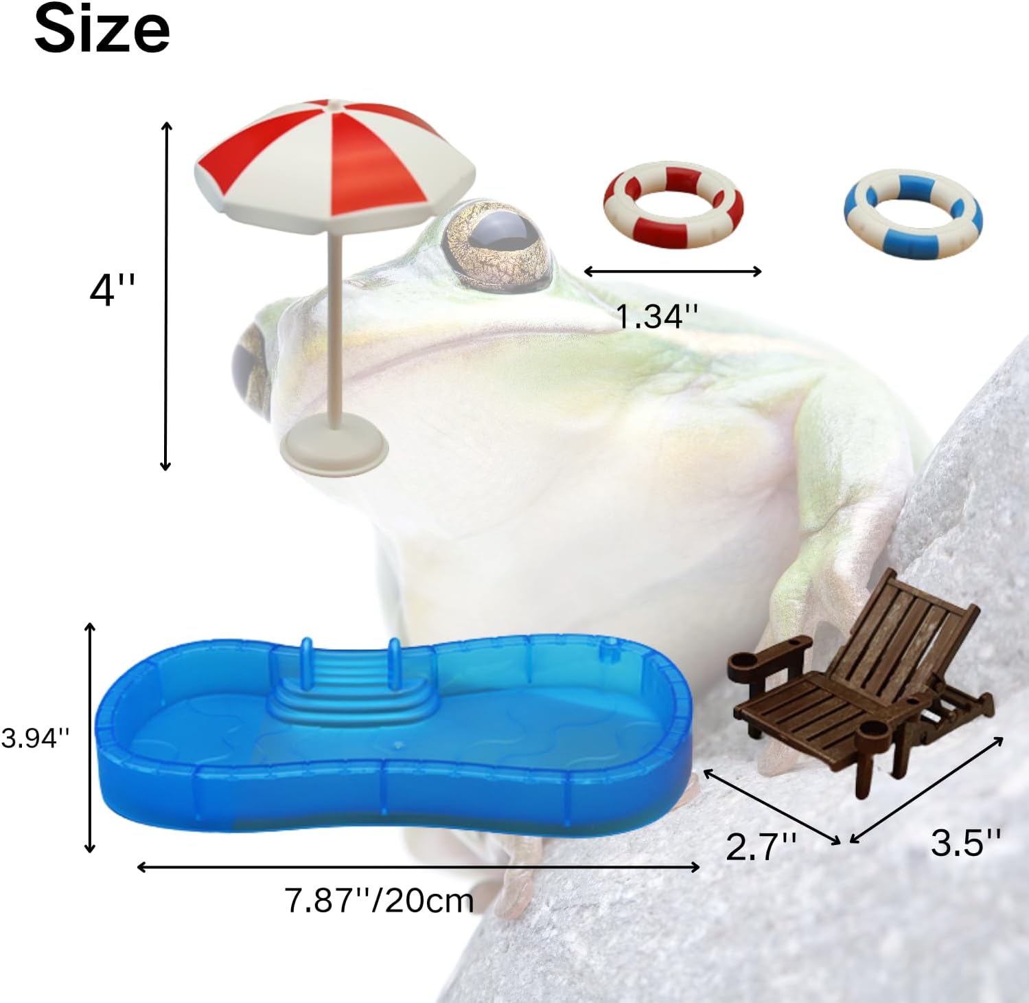 Unique And Stylish Design – Cute pool themed set includes:1 x pool,1 x lounge chair,2 x Swimming ring. These novelty frog habitat terrarium decor will add aesthetic value to any reptile/amphibians habitat whether it be tropical, jungle, or desert-themed.It can blend right into terrariums and vivariums or standout as a focal point in your pet’s habitat setup.What a functional decor indeed