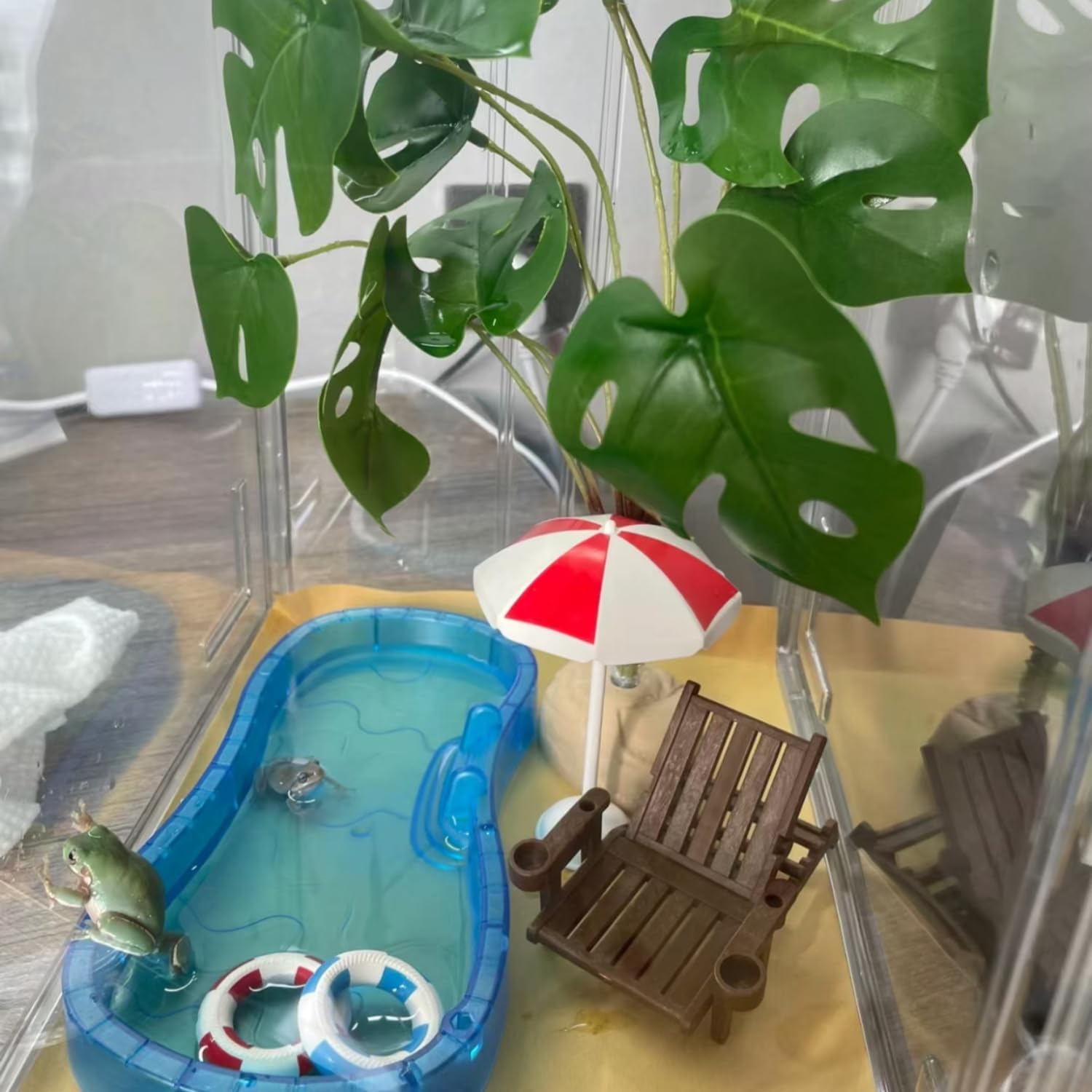 Pool party theme frog habitat terrarium decor , cute and a highlight in your fish or frog tank. Adorable and special water basin for your lovely pet.Suitable for toad frog, tree frog and other small aquatic animals, help you take care of them more easily and safely.