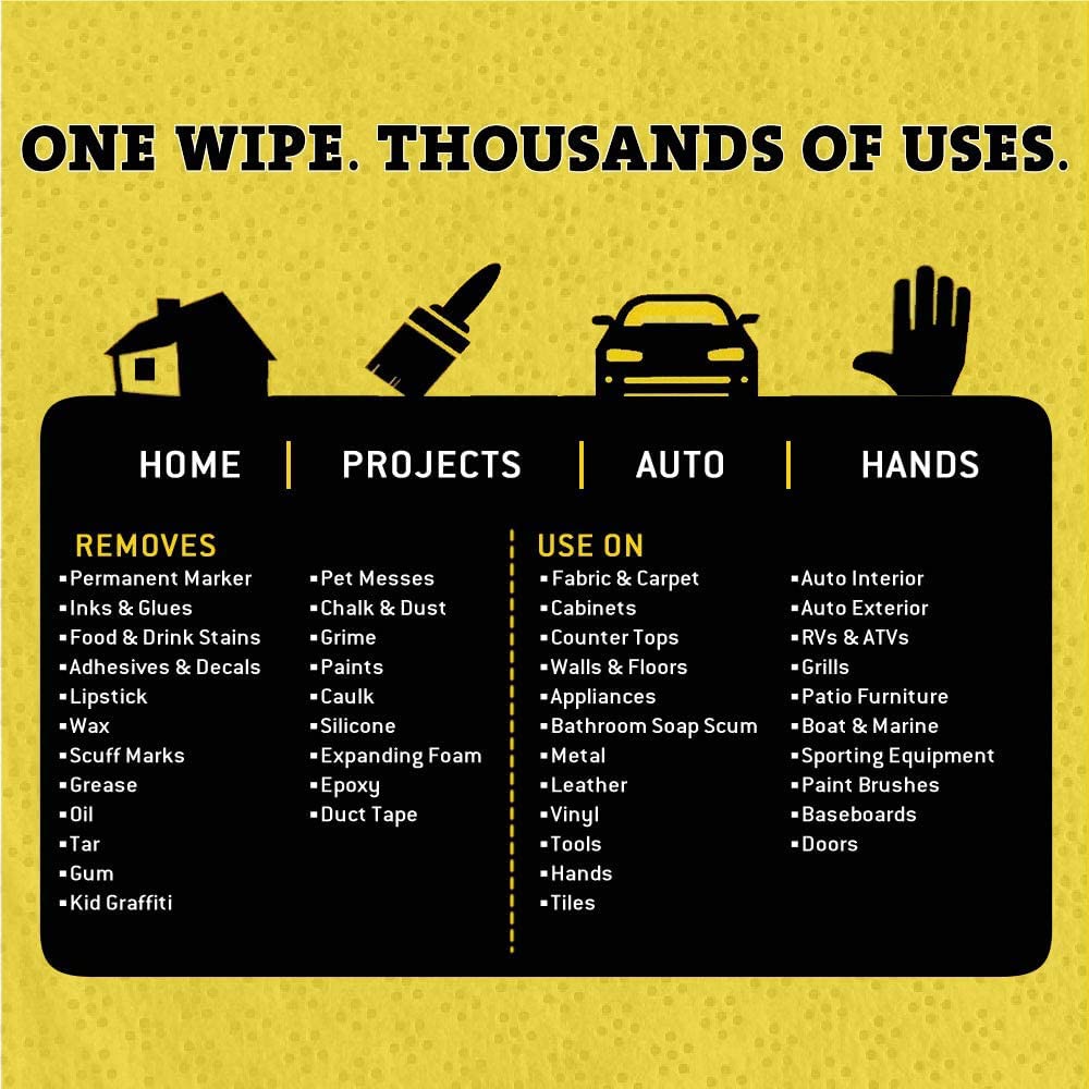 Removes heavy stains others won’t including: grease, tar, ink, paint, permanent marker, wax, scuffs, lip stick, nail polish, food and drinks, pet stains and more