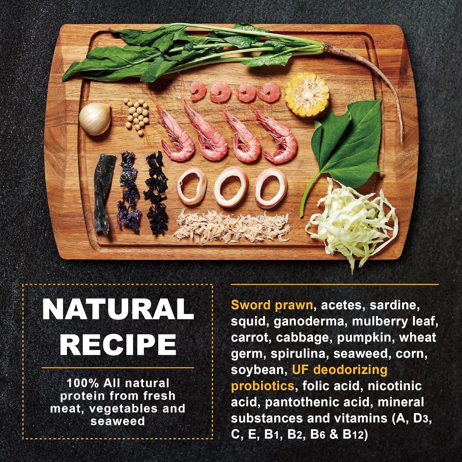 High Palatability : Sword Prawn Flavor – A blend of wild sword prawns, akiami paste shrimp, vegetables and seaweed. A perfect 6:4 meat/vegetable protein ratio