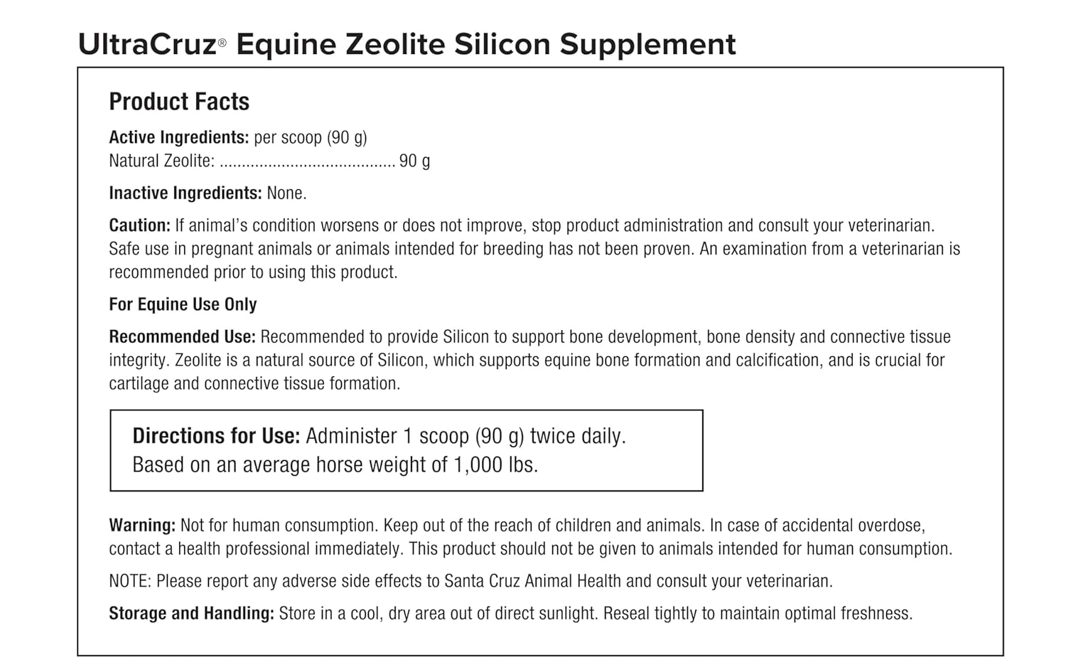 UltraCruz Equine Zeolite Silicon Supplement for Horses is a natural source of Silicon, an important element to maintain healthy bones, tendons and ligaments in the horse. Zeolite is a highly bio-available, natural form of Silicon that supports bone and connective tissue health. Performance horses and senior horses may especially benefit from the addition of this high quality, palatable powder.