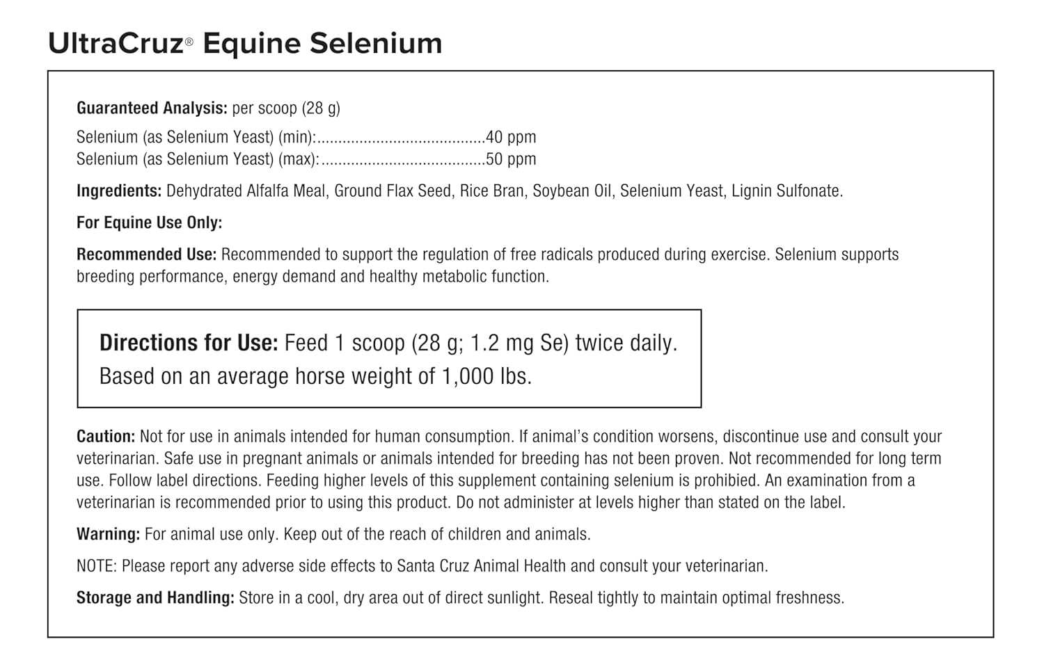 UltraCruz Equine Selenium Supplement for Horses is an equine dietary supplement that provides organic Selenium, an important antioxidant and trace mineral for horses that helps provide the body with nerve, muscle and joint support. In addition to helping to reduce oxidative stress, Selenium supports breeding performance and normal metabolic function. Performance horses participating in rigorous activity can benefit from additional antioxidant supplementation. This palatable powder formula may be especially beneficial for horses living in Selenium deficient regions.