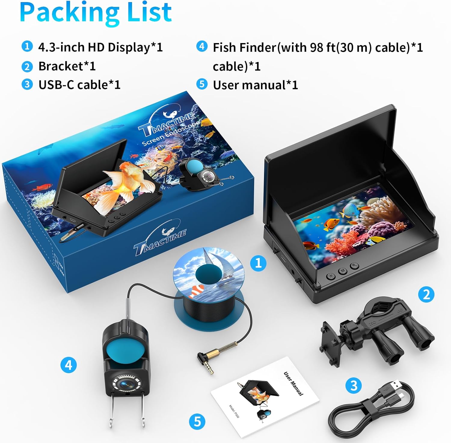 Portable & Easy to Use – No complicated setup—just plug and play! This fish finder camera is a must-have fishing camera accessory for anglers. Includes: 1 monitor, 1 underwater fishing camera (30m cable), 1 stand, 1 charging cable, and 1 manual. (Real-time viewing only; no recording.)