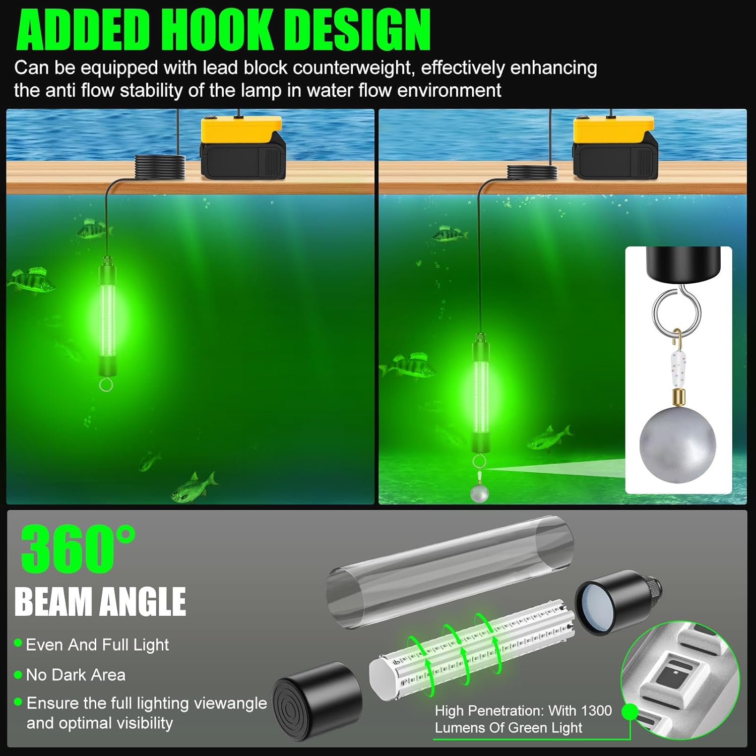 Underwater Fishing Light Compatible for Dewalt 20V Battery,LED Green Light for IP68 1300 Lumens Fish Attracting, Night Fishing for Docks Boats or Kayaks(no Battery)