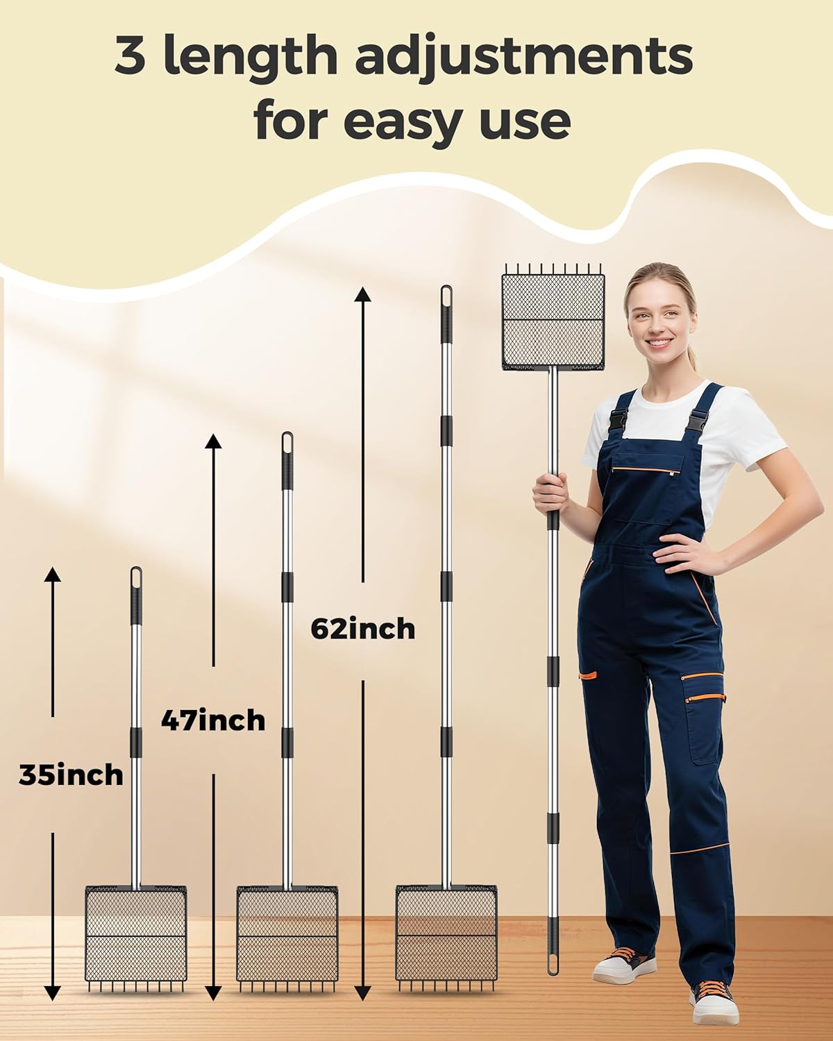 Upgraded Chicken Poop Scooper & Rake 2-in-1,Coop Cleaning Tool Metal Scoop,0.25″ fine mesh Sand Sifting Shovel with 35″ to 62″ Adjustable Stainless Steel Handle for Chicken Coops & Farm Animals Scoop