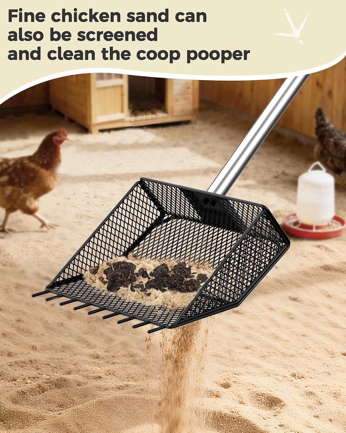 Versatile for Multiple Scenarios: This multifunctional litter sifting shovel is not just limited to chicken coops. It can be used in a variety of settings, including goat stalls and horse stables. The durable construction and stainless steel handle make it suitable for handling different types of litter and waste. Whether you have a small backyard setup or a large farm, this chicken pooper scooper for sand is up to the task