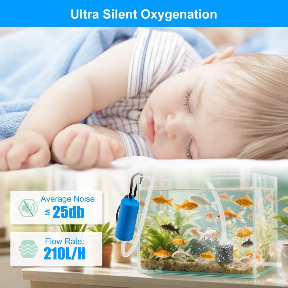 【Ultra Silent Oxygenation】: DaToo’s USB Aquarium Oxygen Pump is powered by an ultra-quiet, pressurized electric ceramic motor, which effectively reduces the friction and vibration between the components when the motor is running, thus reducing the noise. It operates at only 20 decibels, so quiet that you can hardly notice it’s running, and at the same time, it can powerfully boost oxygen at a maximum flow rate of 210L/H, creating a quiet and oxygen-rich living environment for fish.
