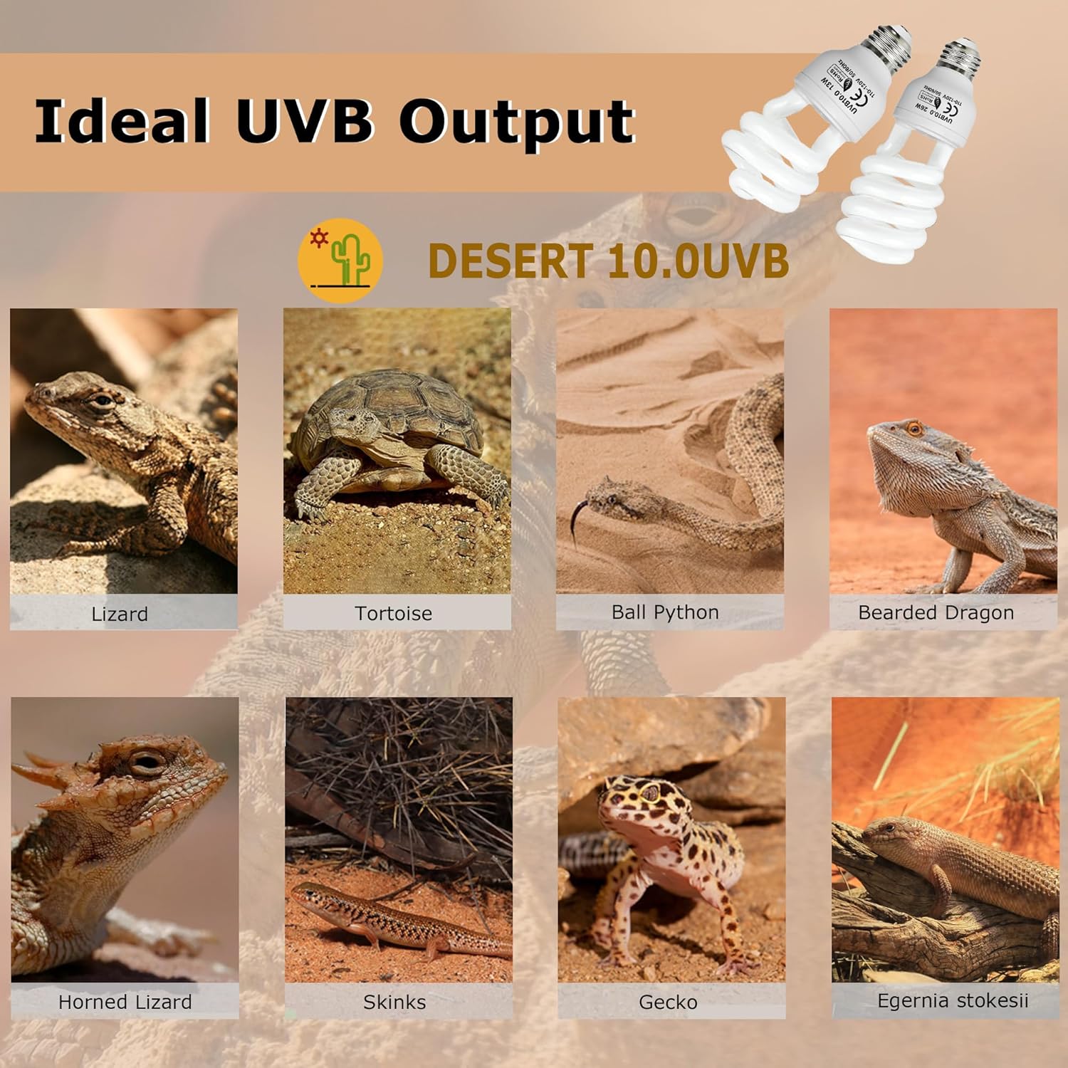 High Output UVB Lamp – The 13W UVB lamp is specially designed for desert-dwelling reptiles (such as bearded dragons, geckos, and snakes), providing high output UVB to help enhance the synthesis of vitamin D3, promote calcium absorption, and support healthy bone development.