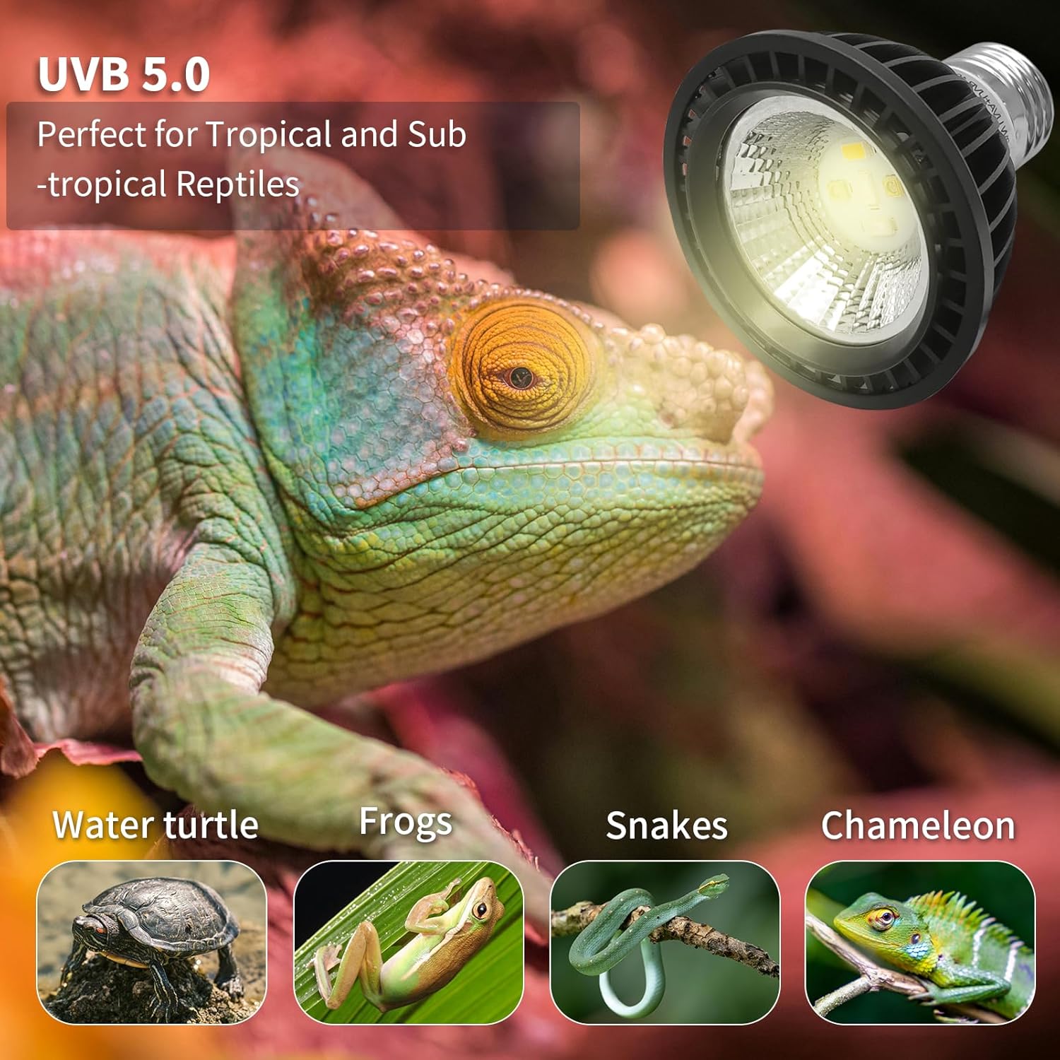 Suitable for tropical rainforest reptiles: The UVB 5.0 reptile light bulb is suitable for tropical rainforest reptiles, including iguanas, chameleons, lizards ,snake, frogs, toads and tortoise. Taking a few hours of UVB light every day can greatly enhance the vitality of reptile pet crawling and prevent and treat diseases.